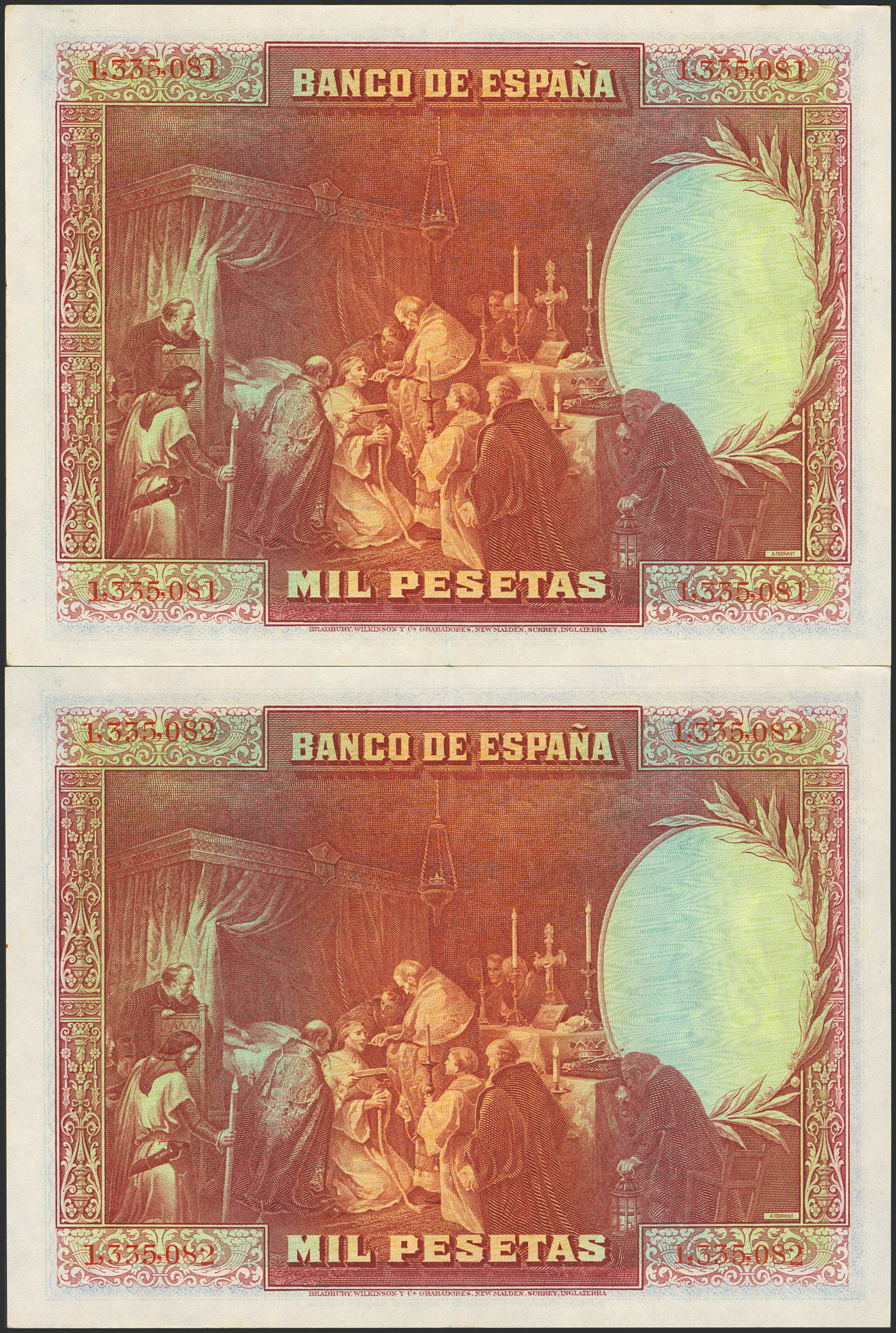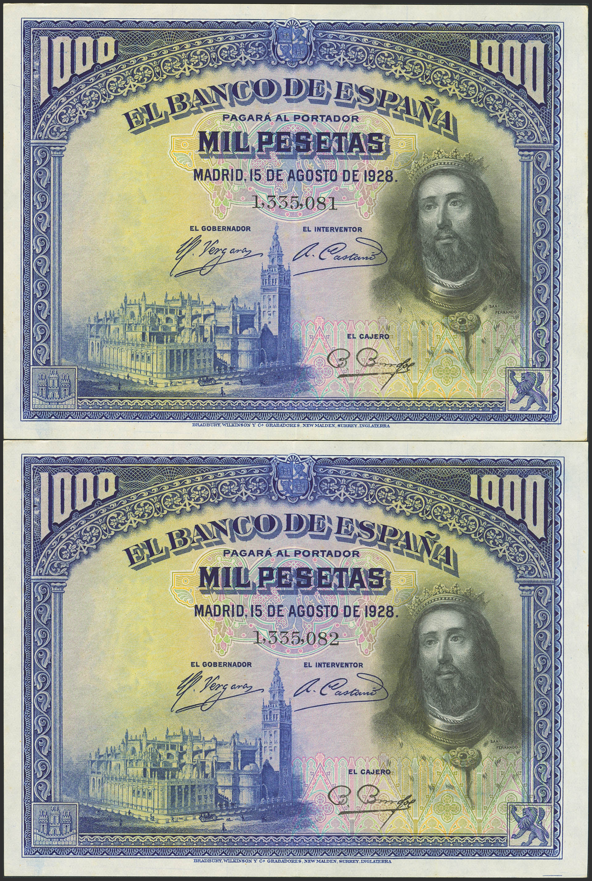 1000 Pesetas. 15 de Agosto de 1928. Pareja correlativa. Sin serie. (Edifil 2023: 357). Conservan gran parte de su apresto original. EBC+.