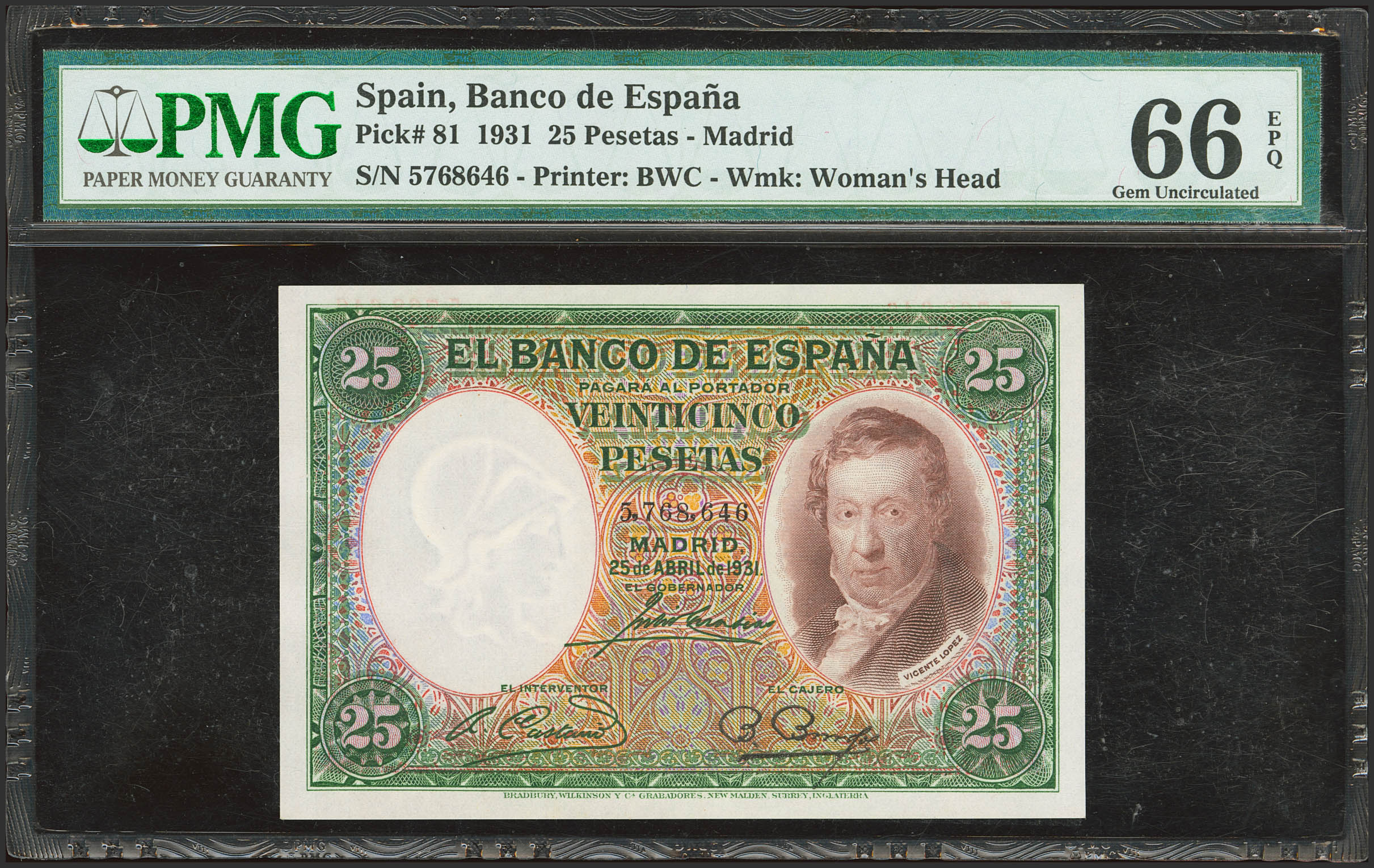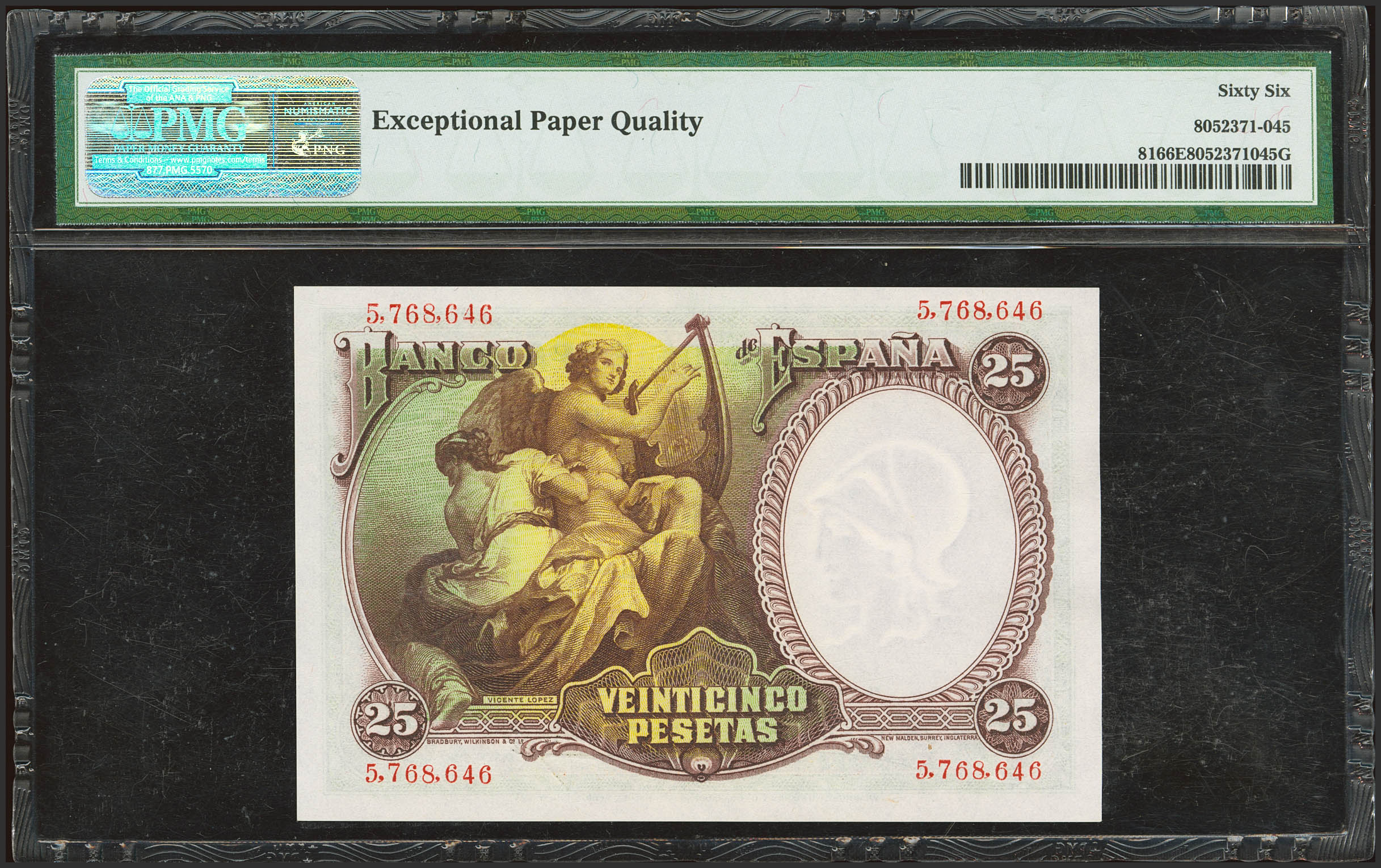 25 Pesetas. 25 de Abril de 1931. Sin serie. (Edifil 2023: 358, Pick: 81). Apresto original. SC. Encapsulado PMG66EPQ.