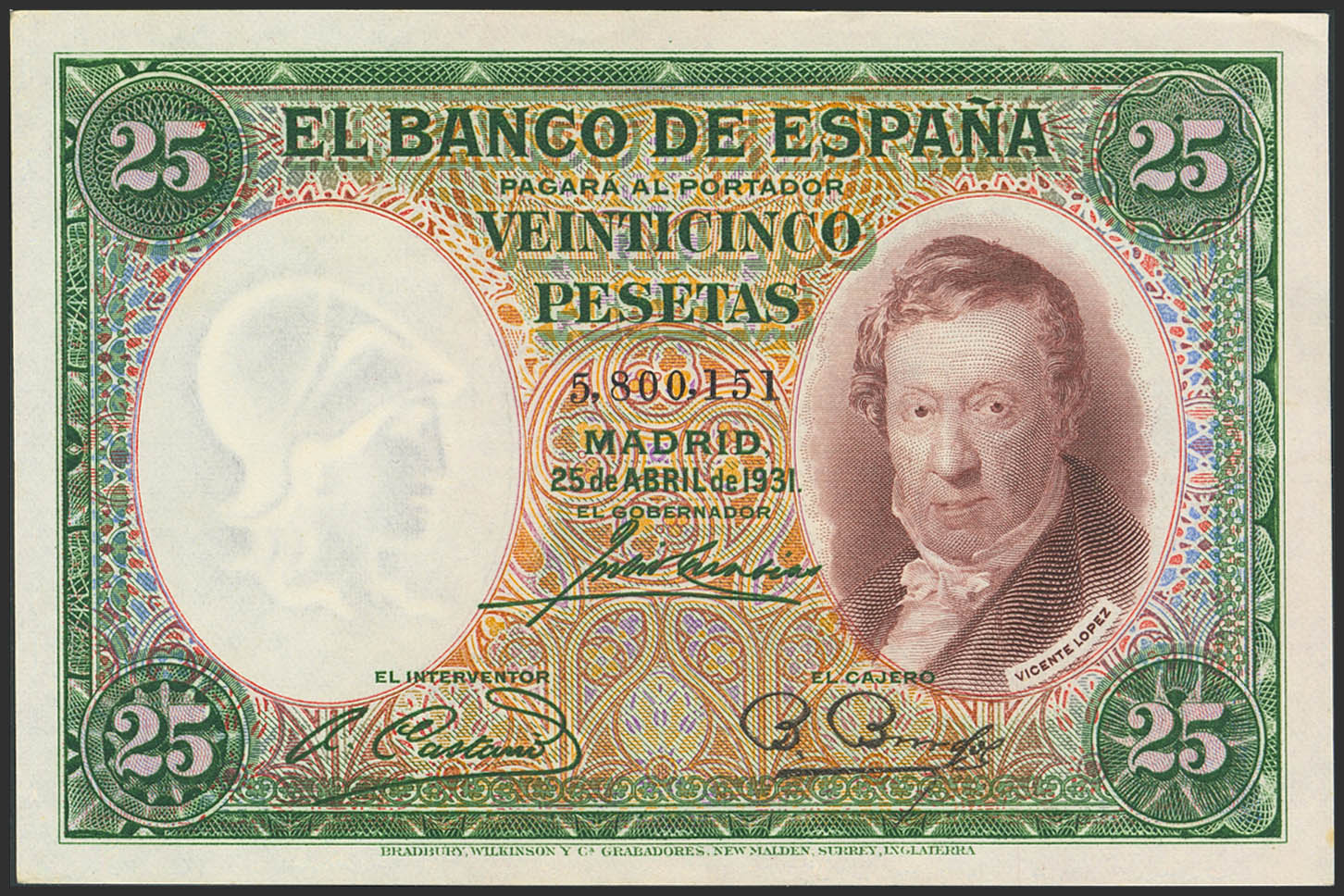 25 Pesetas. 25 de Abril de 1931. Sin serie. (Edifil 2023: 358). Apresto original. SC-.