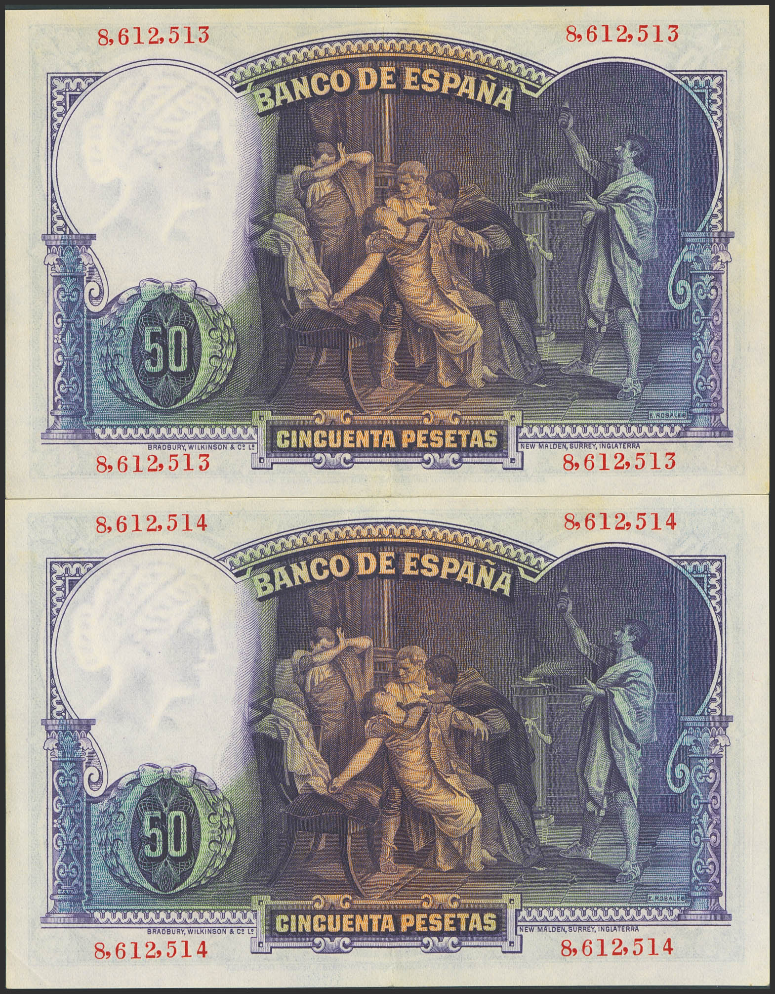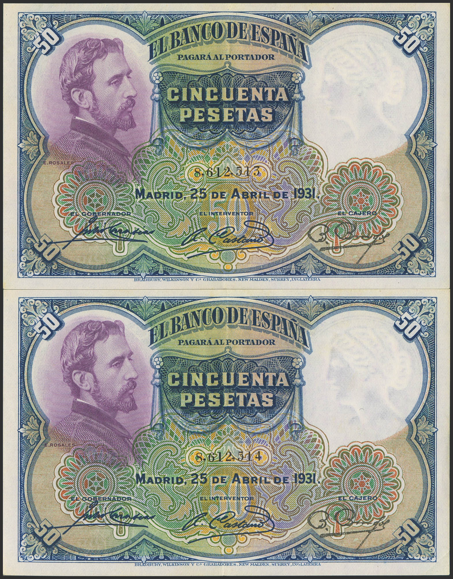 50 Pesetas. 25 de Abril de 1931. Pareja correlativa. Sin serie. (Edifil 2023: 359). Conservan gran parte de su apresto original. EBC+++.