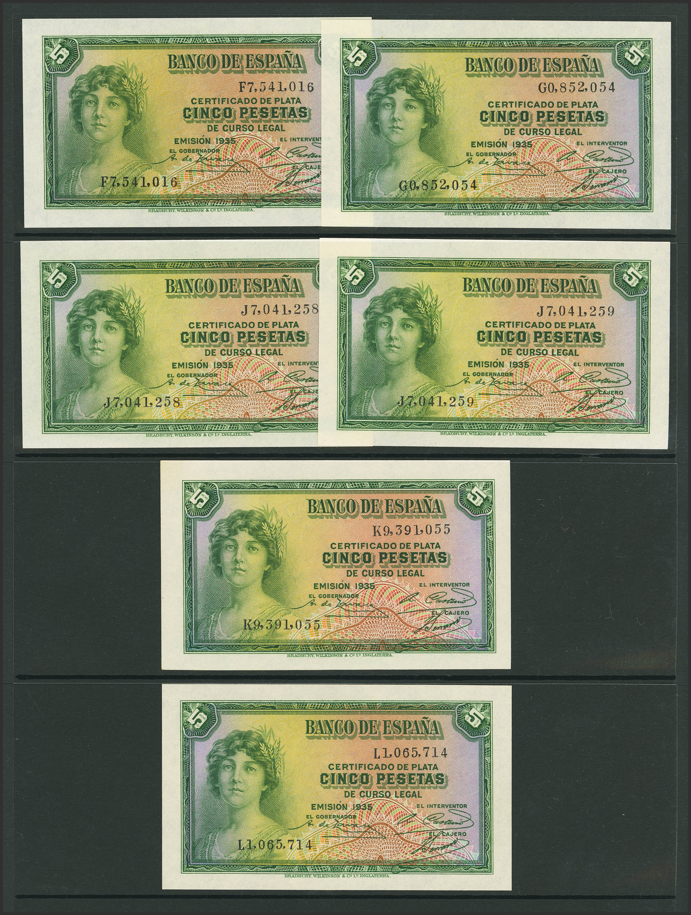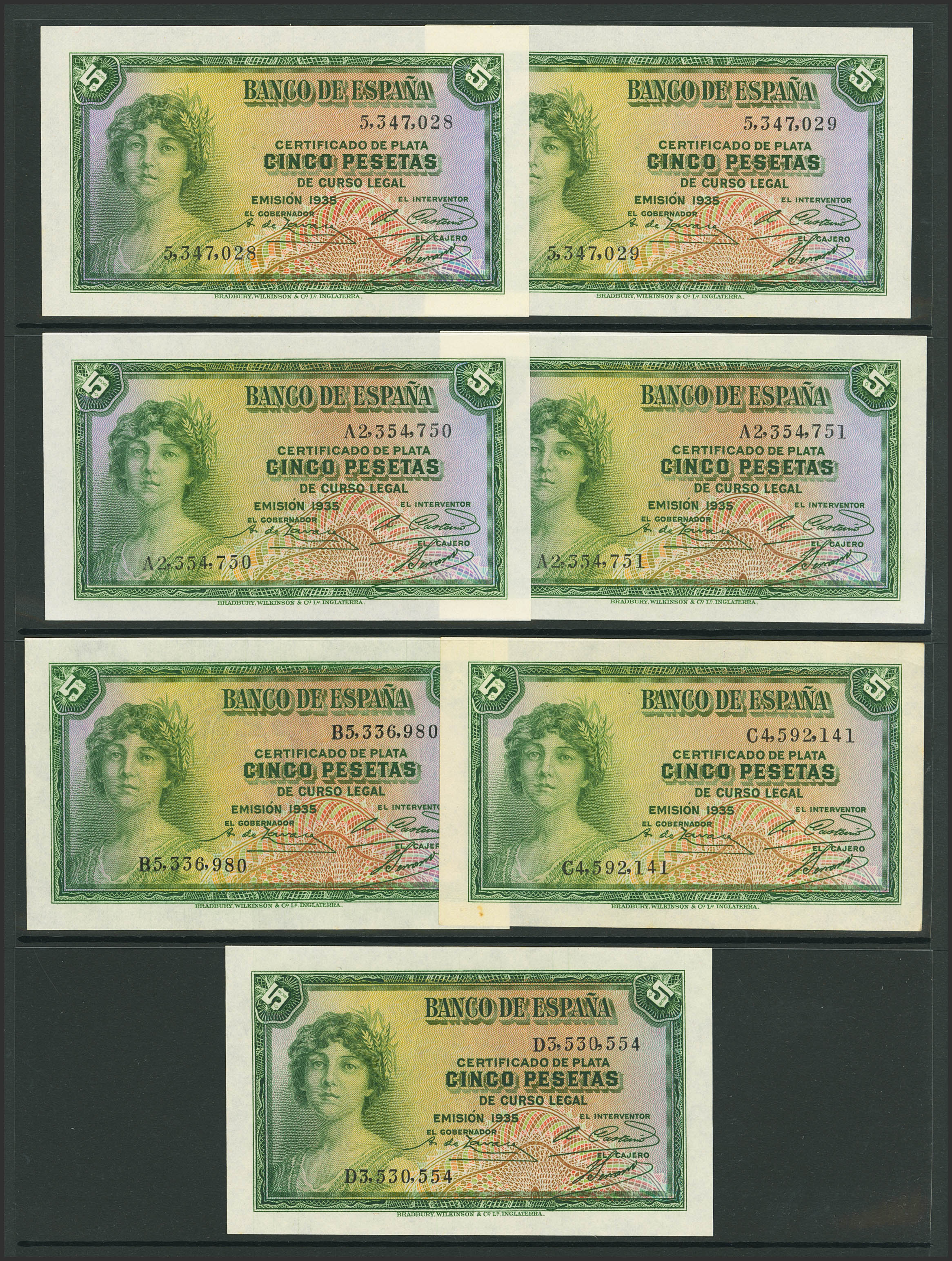 Precioso conjunto de 13 billetes de 5 Pesetas de Certificado de Plata emitidos en 1935, sin serie (pareja correlativa), serie A (pareja correlativa), B, C, D, F, G, J (pareja correlativa), K y L, última serie emitida. (Edifil 2023: 363, 363a, 363b, 363c). Muy raro conjunto completo. SC/SC-.