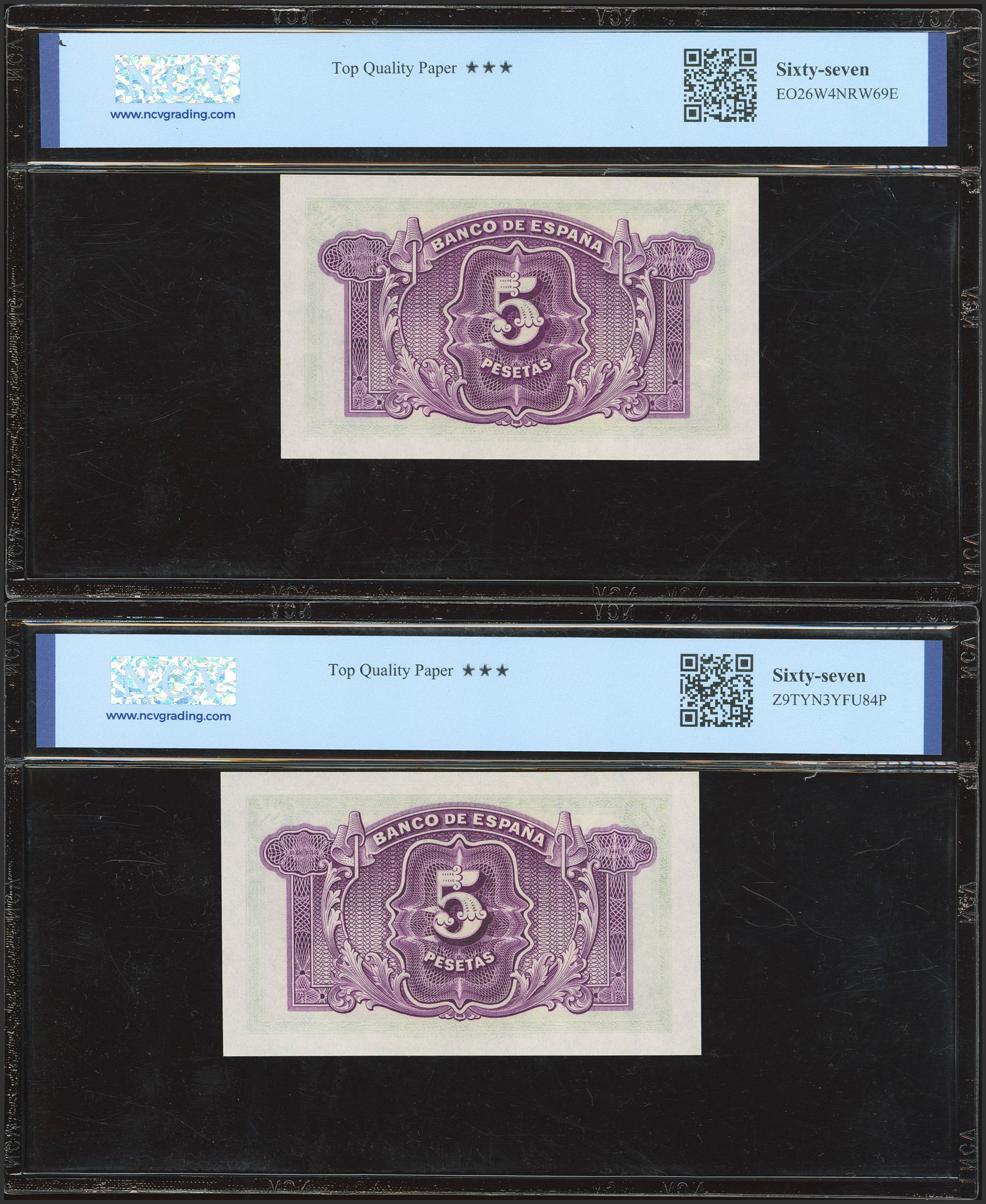 5 Pesetas. 1935. Certificado de Plata. Pareja correlativa. Sin serie. (Edifil 2023: 363, Pick: 85a). Apresto original. SC. Encapsulados NCV67TPQ, ambos.