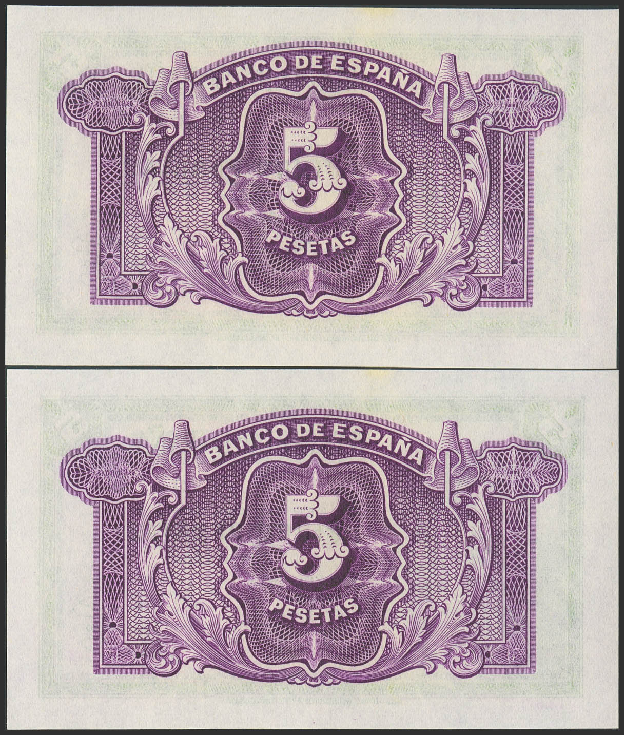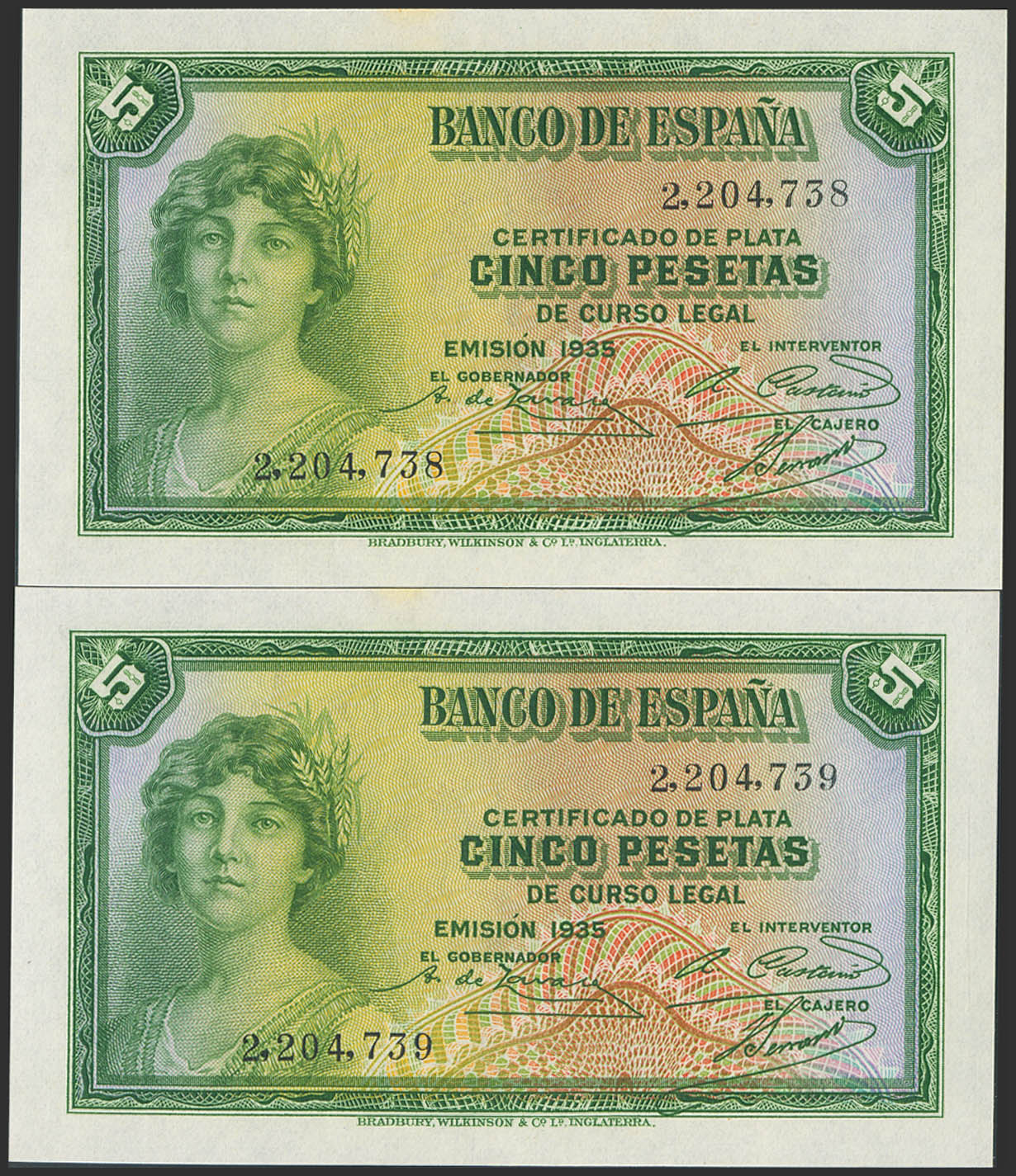 5 Pesetas. 1935. Certificado de Plata. Pareja correlativa. Sin serie. (Edifil 2023: 363). Apresto original. SC-.