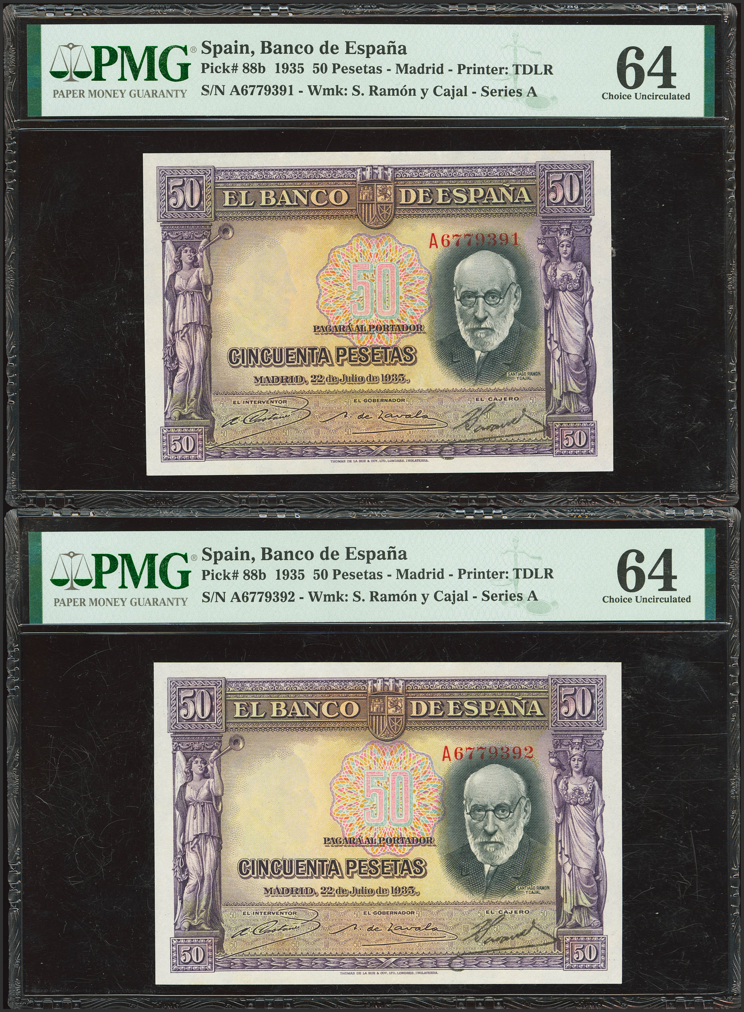 50 Pesetas. 22 de Julio de 1935. Pareja correlativa. Serie A. (Edifil 2023: 366a, Pick: 88b). Rara pareja. SC. Encapsulados PMG64, ambos.