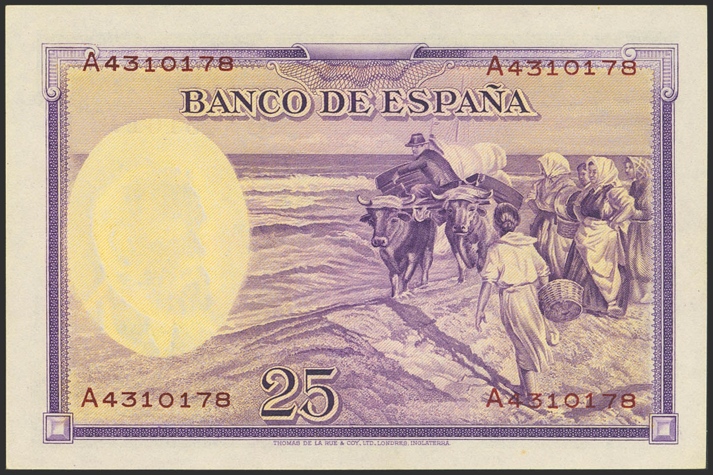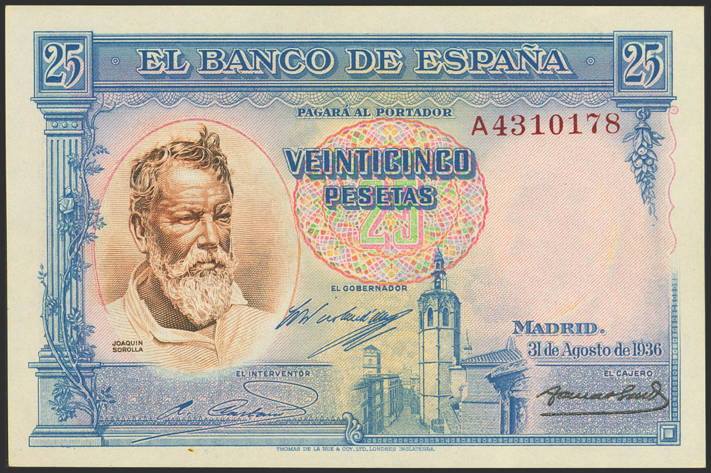 25 Pesetas. 31 de Agosto de 1936. Serie A. (Edifil 2023: 367a). Apresto original, mínimamente tonalizado. SC-.