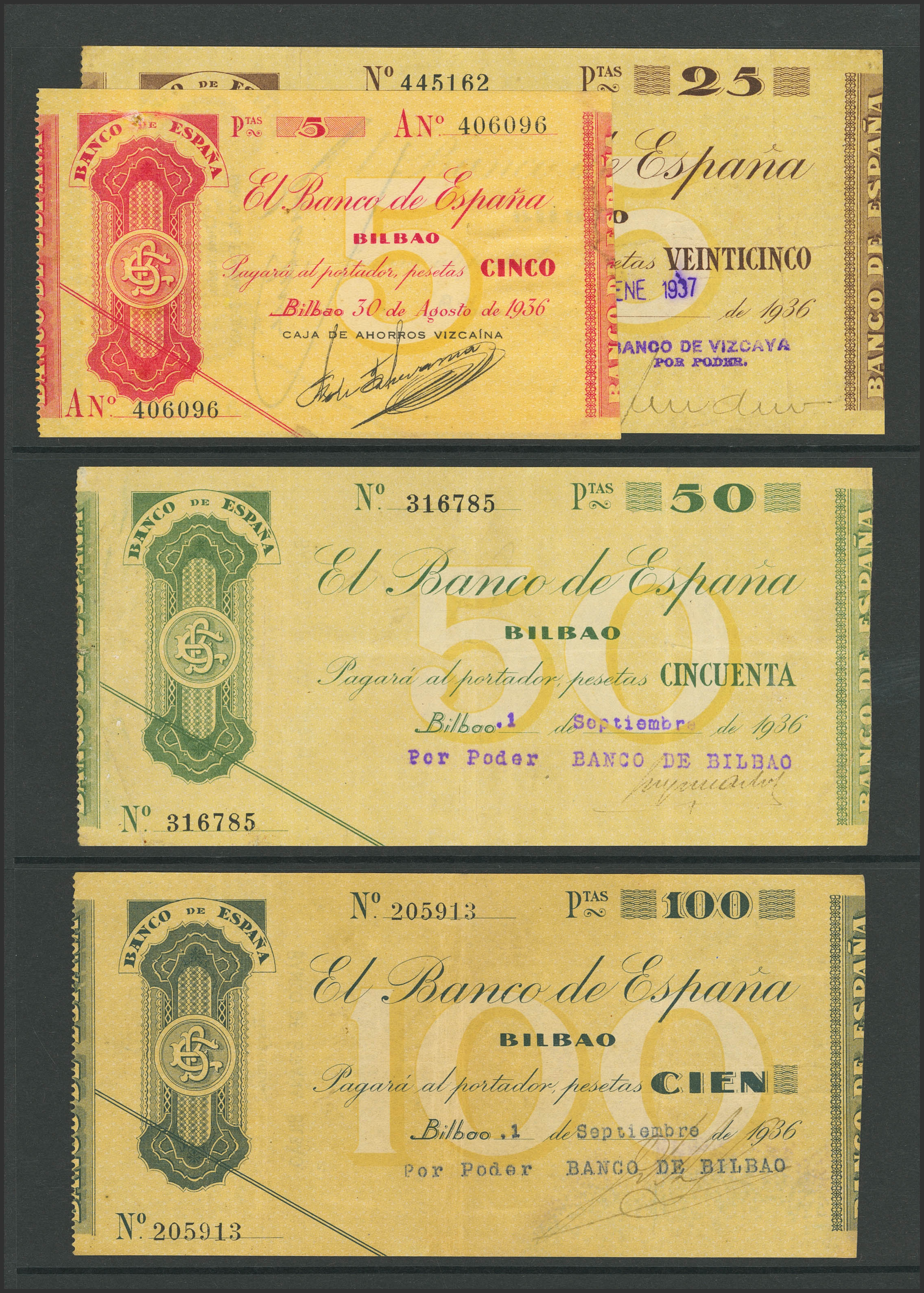 Conjunto de 4 billetes del Banco de Bilbao, emitidos en 1936, 5 Pesetas serie A, 25 Pesetas, 50 Pesetas y 100 Pesetas, diversas antefirmas. (Edifil 2023: 368A/71). MBC+.