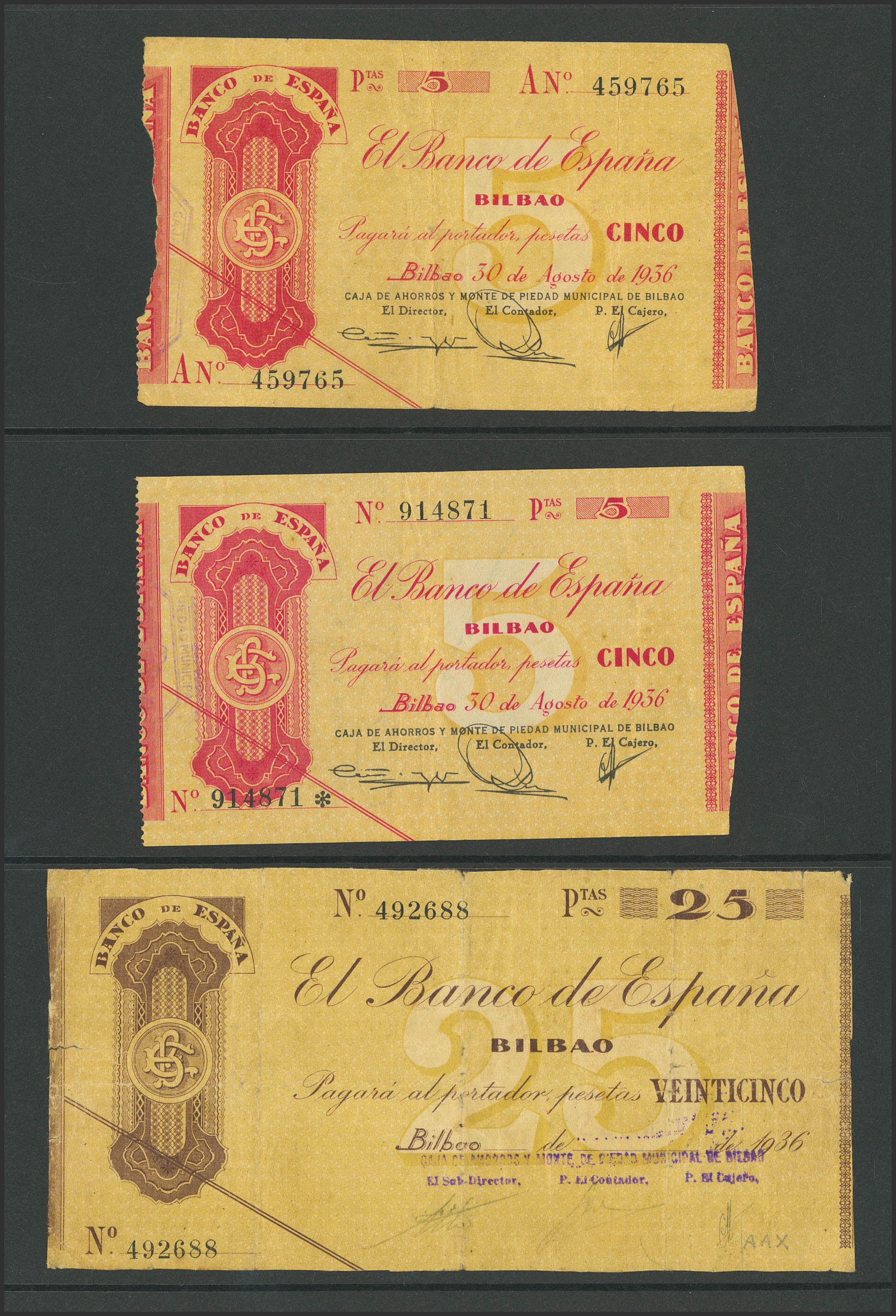 Serie completa de 5 billetes del Banco de Bilbao, emitidos en 1936 incluyendo el 5 Pesetas (sin serie y serie A), 25 Pesetas, 50 Pesetas y 100 Pesetas, con la antefirma Caja de Ahorros y Monte Piedad Municipal de Bilbao. (Edifil 2023: 368b, 369j, 370f, 371a, 368Ac). MBC+/BC+.