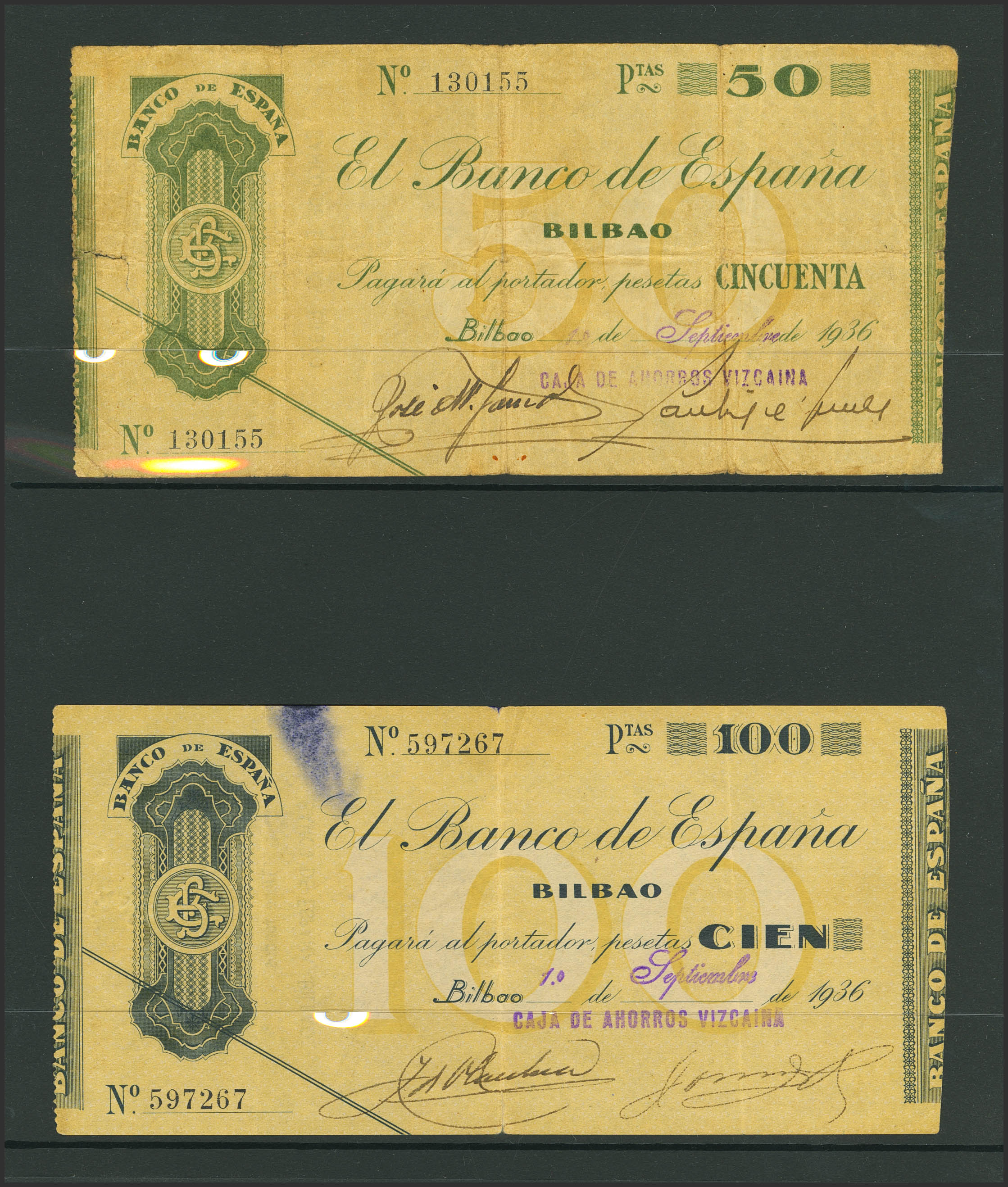 Serie completa de 5 billetes del Banco de Bilbao, emitidos en 1936 incluyendo el 5 Pesetas (sin serie y serie A), 25 Pesetas, 50 Pesetas y 100 Pesetas, con la antefirma Caja de Ahorros Vizcaína. (Edifil 2023: 368c, 369i, 370b, 371g, 368Aa). MBC-/BC+.