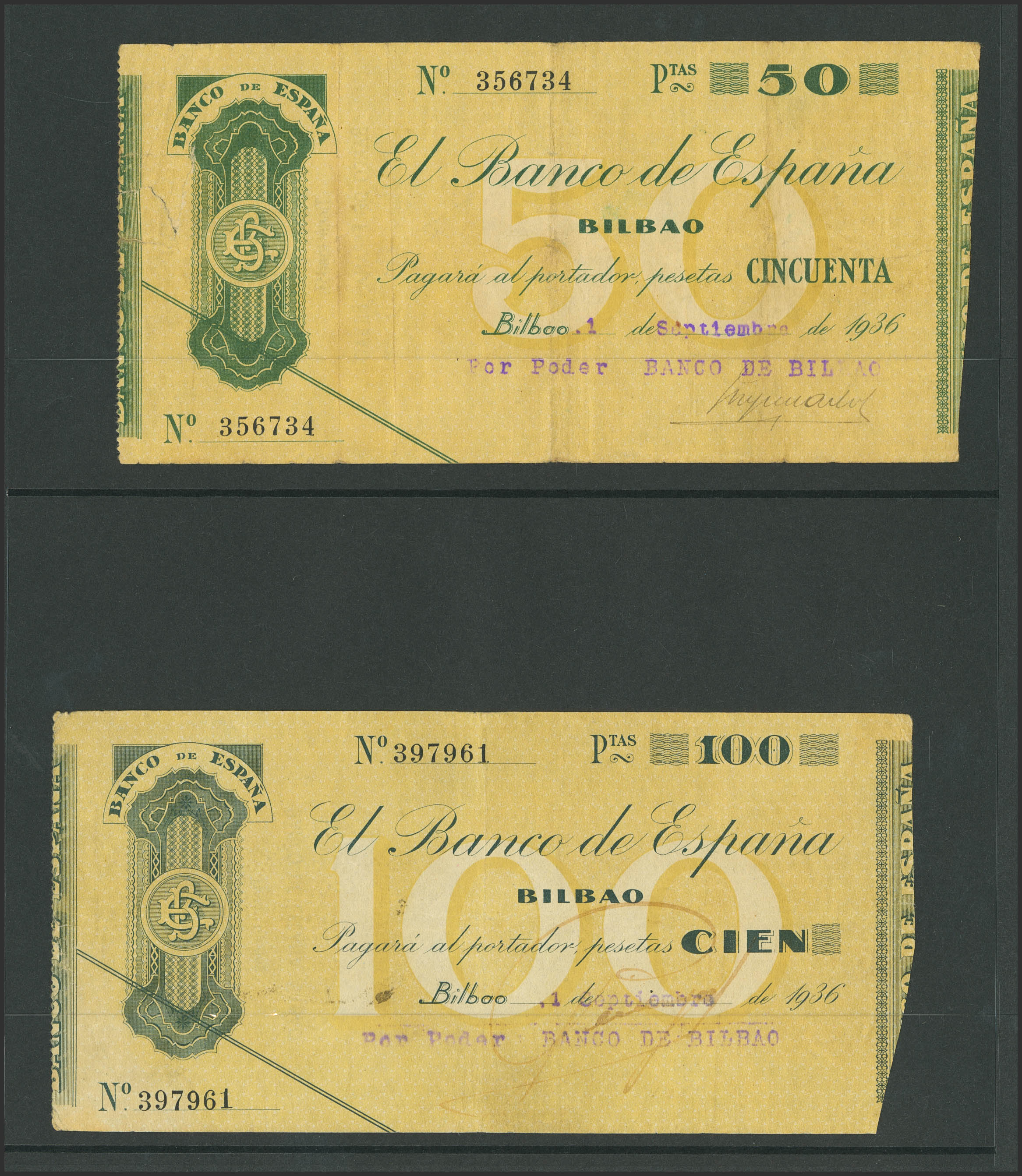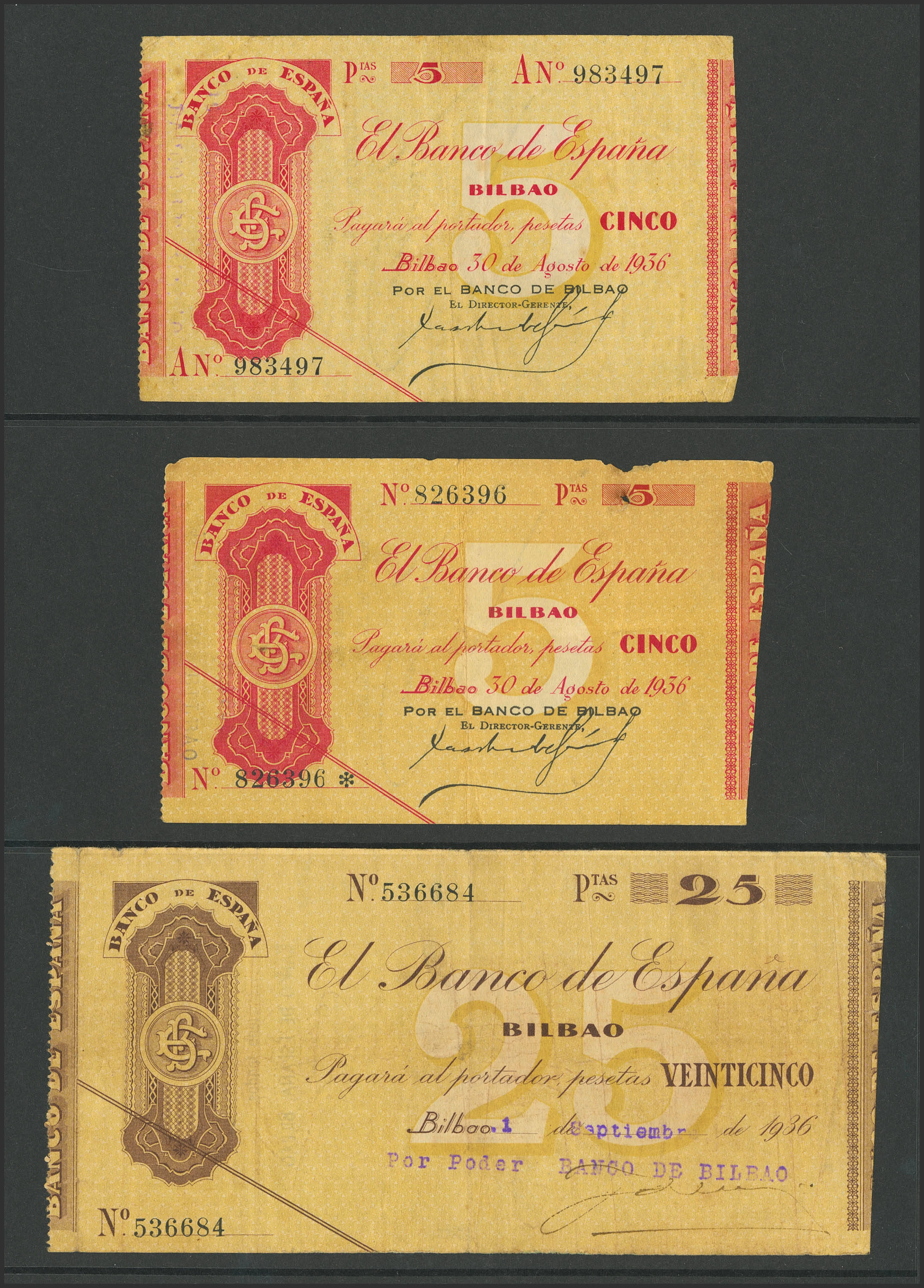 Serie completa de 5 billetes del Banco de Bilbao, emitidos en 1936 incluyendo el 5 Pesetas (sin serie y serie A), 25 Pesetas, 50 Pesetas y 100 Pesetas, con la antefirma Banco de Bilbao. (Edifil 2023: 368f, 369f, 370c, 371f, 368Ab). MBC+/BC+.