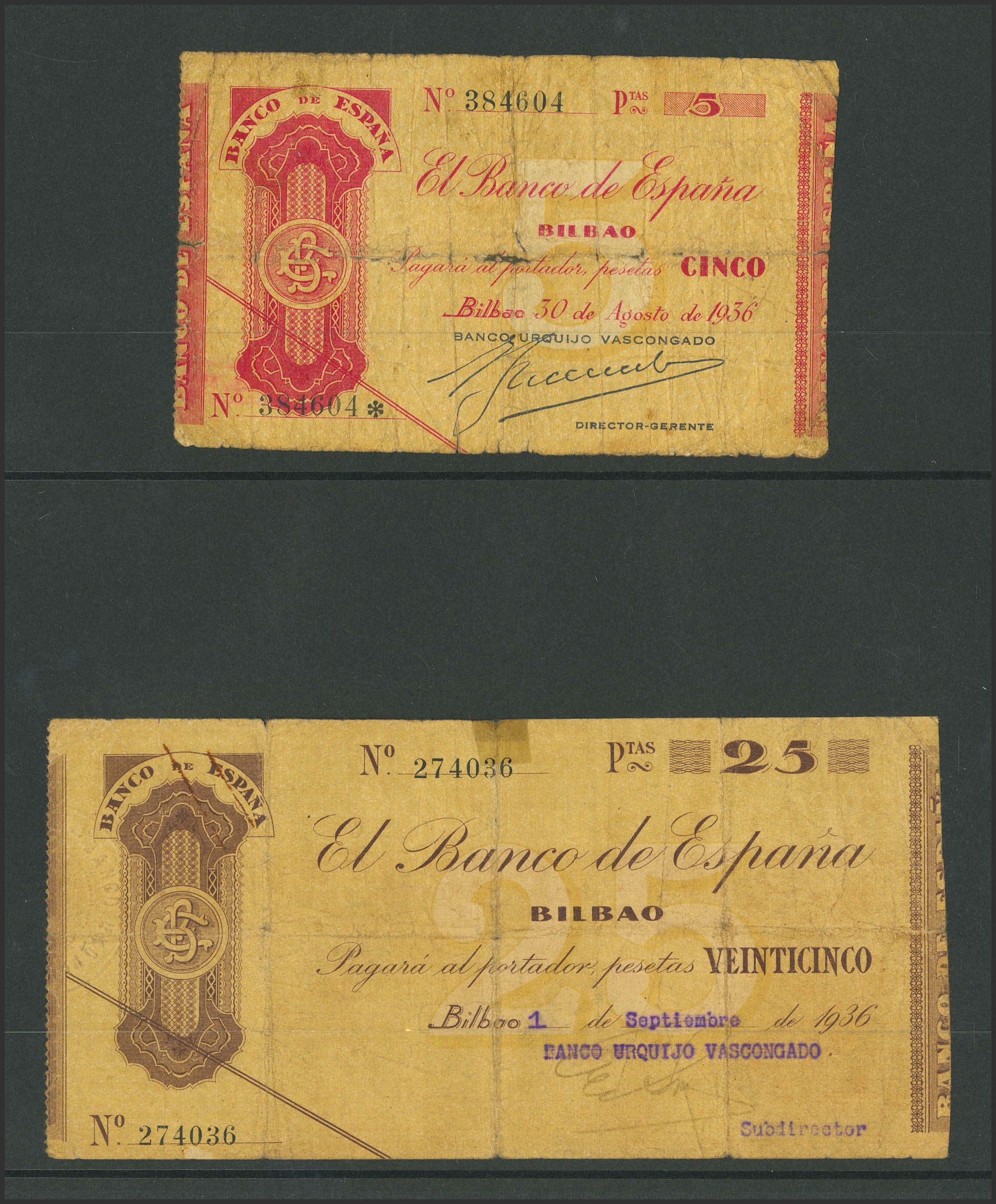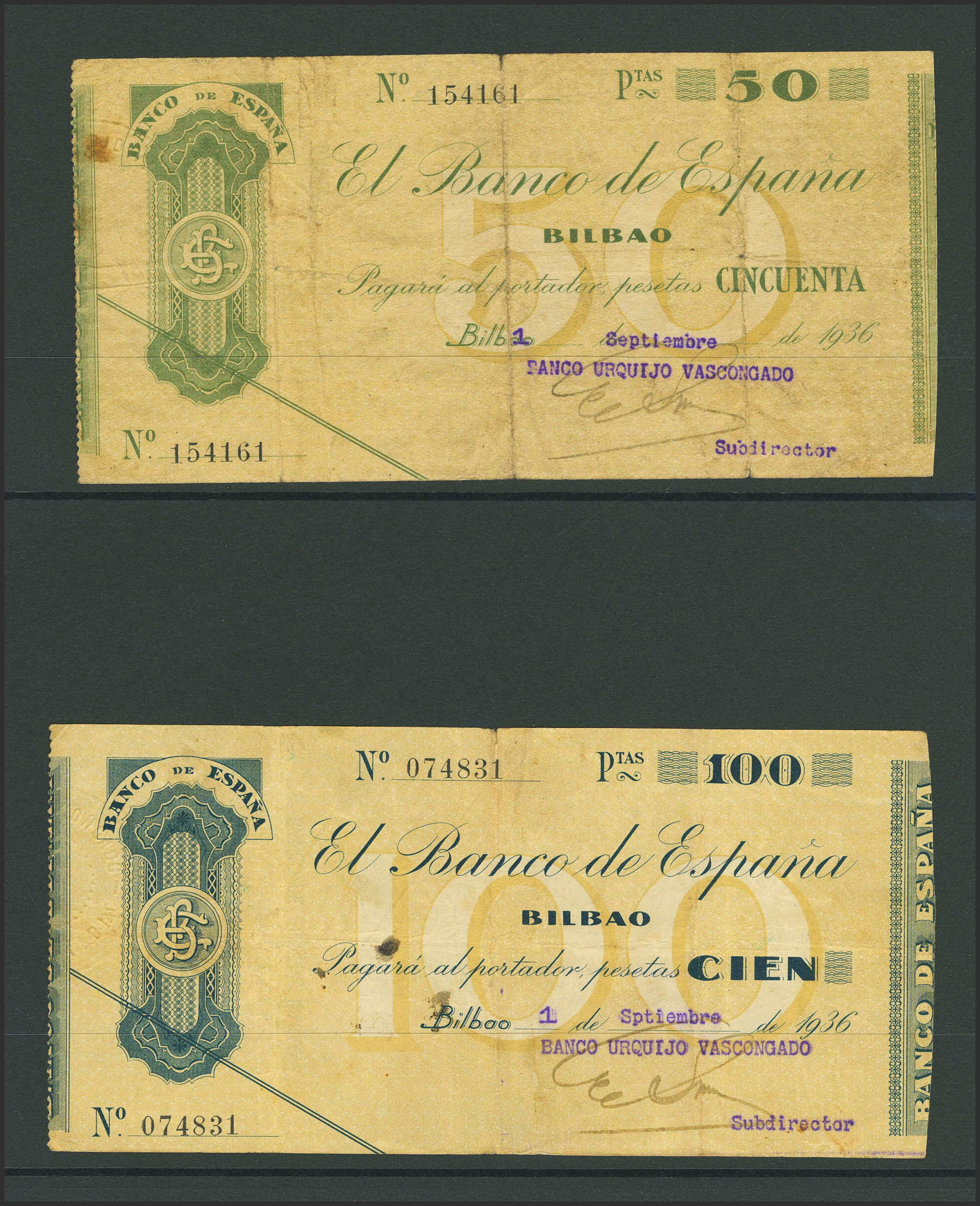 Serie completa de 4 billetes del Banco de Bilbao, emitidos en 1936 incluyendo el 5 Pesetas, 25 Pesetas, 50 Pesetas y 100 Pesetas, con la antefirma Banco Urquijo Vascongado (esta antefirma no se conoce en el 5 pts con la serie A). (Edifil 2023: 368j, 369g, 370j, 371i). MBC-/BC+.