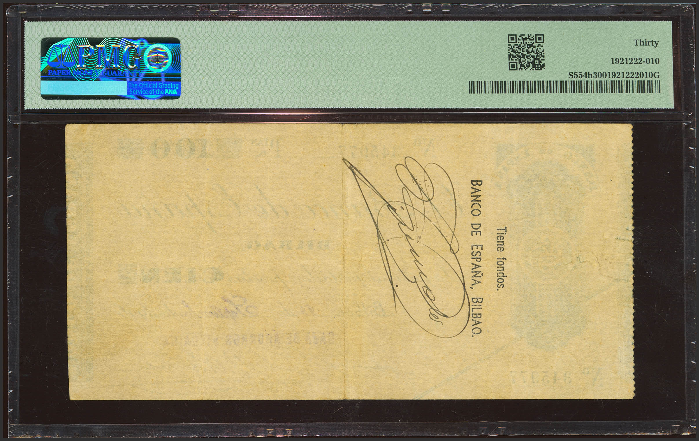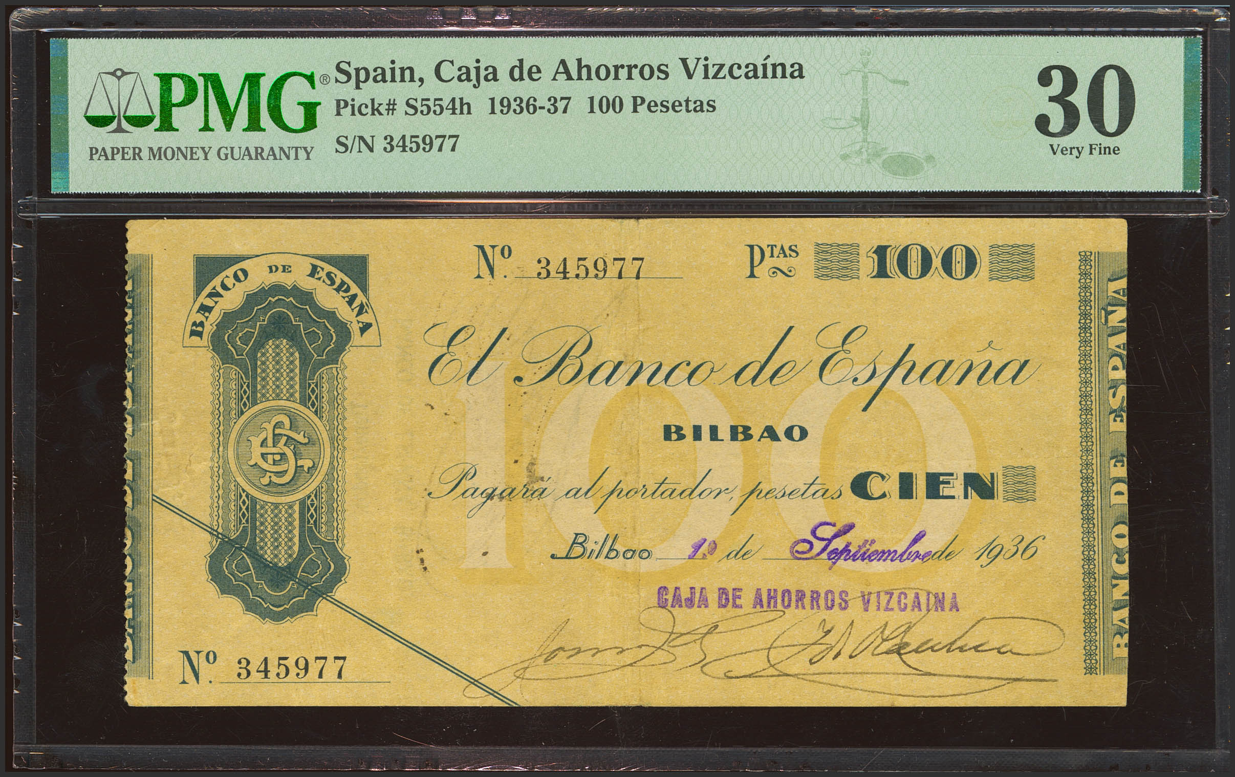 100 Pesetas. 1 de Septiembre de 1936. Sin serie. Sucursal de Bilbao y antefirma Caja de Ahorros Vizcaína. (Edifil 2023: 371g, Pick: S554h). MBC+. Encapsulado PMG30.
