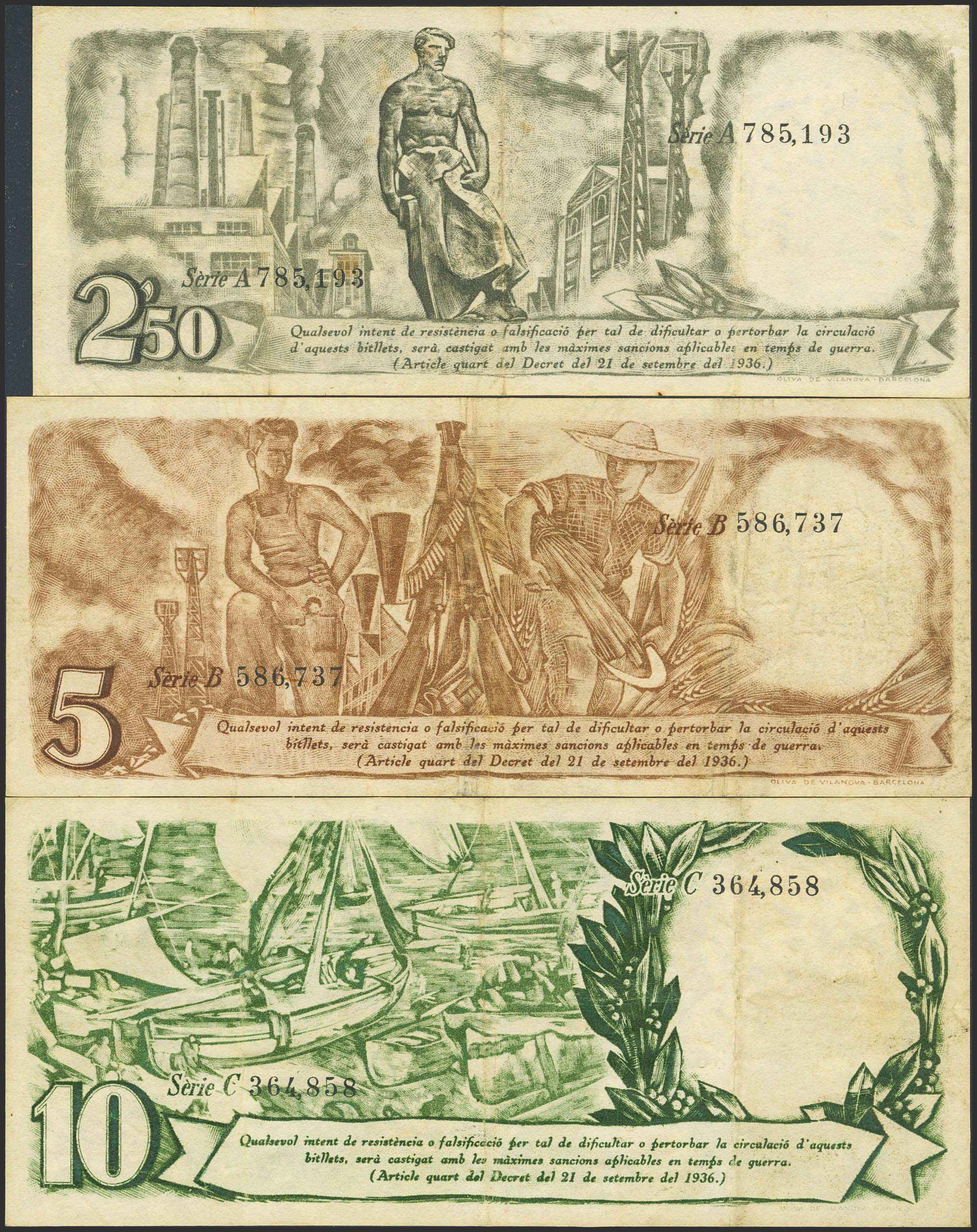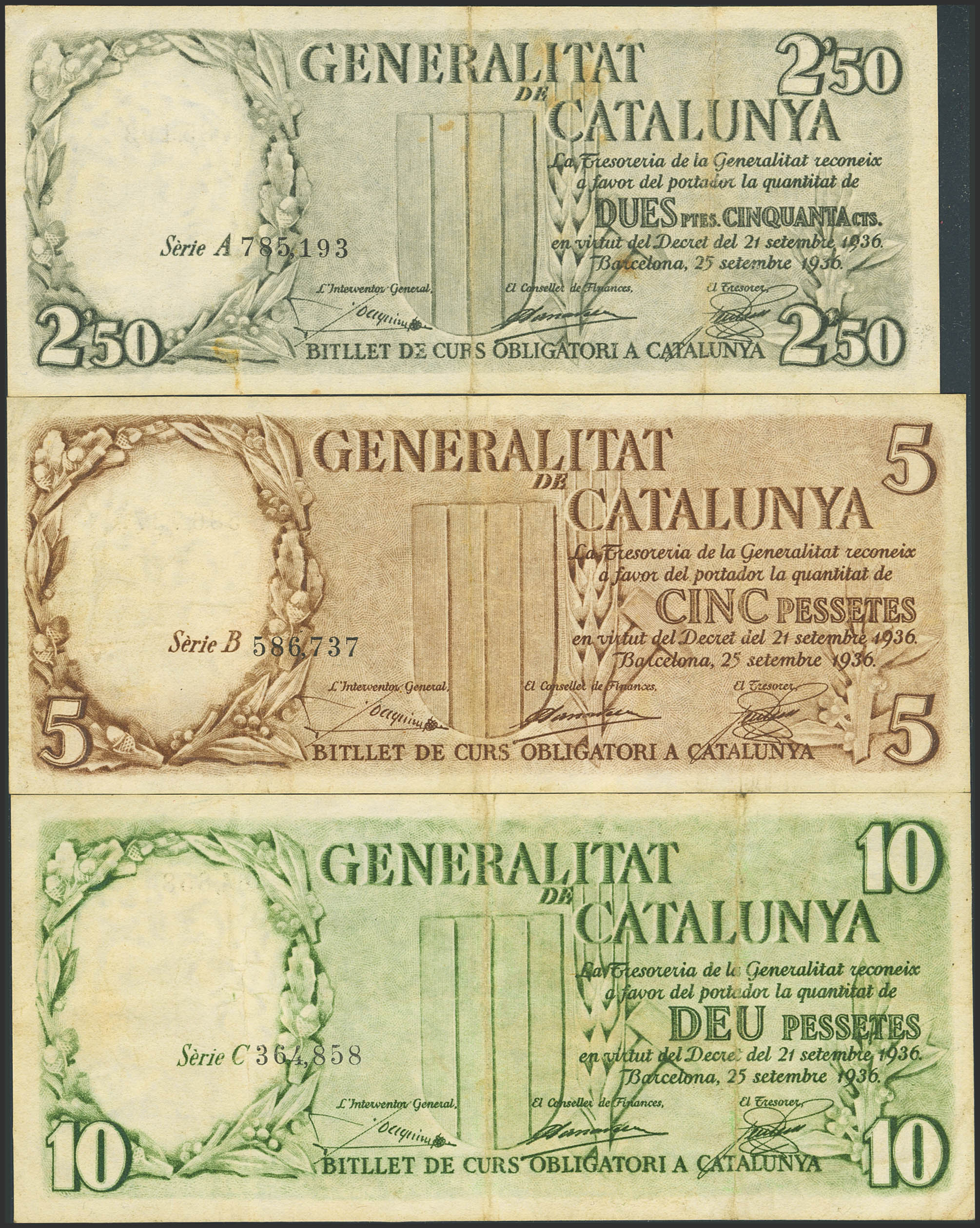 Conjunto de 3 billetes de la Generalitat de Catalunya, el 2´50 Pesetas con la numeración en negro, 5 Pesetas y 10 Pesetas, emitidos el 25 de Septiembre de 1936, con las series A, B y C, respectivamente. (Edifil 2023: 372/74). MBC.
