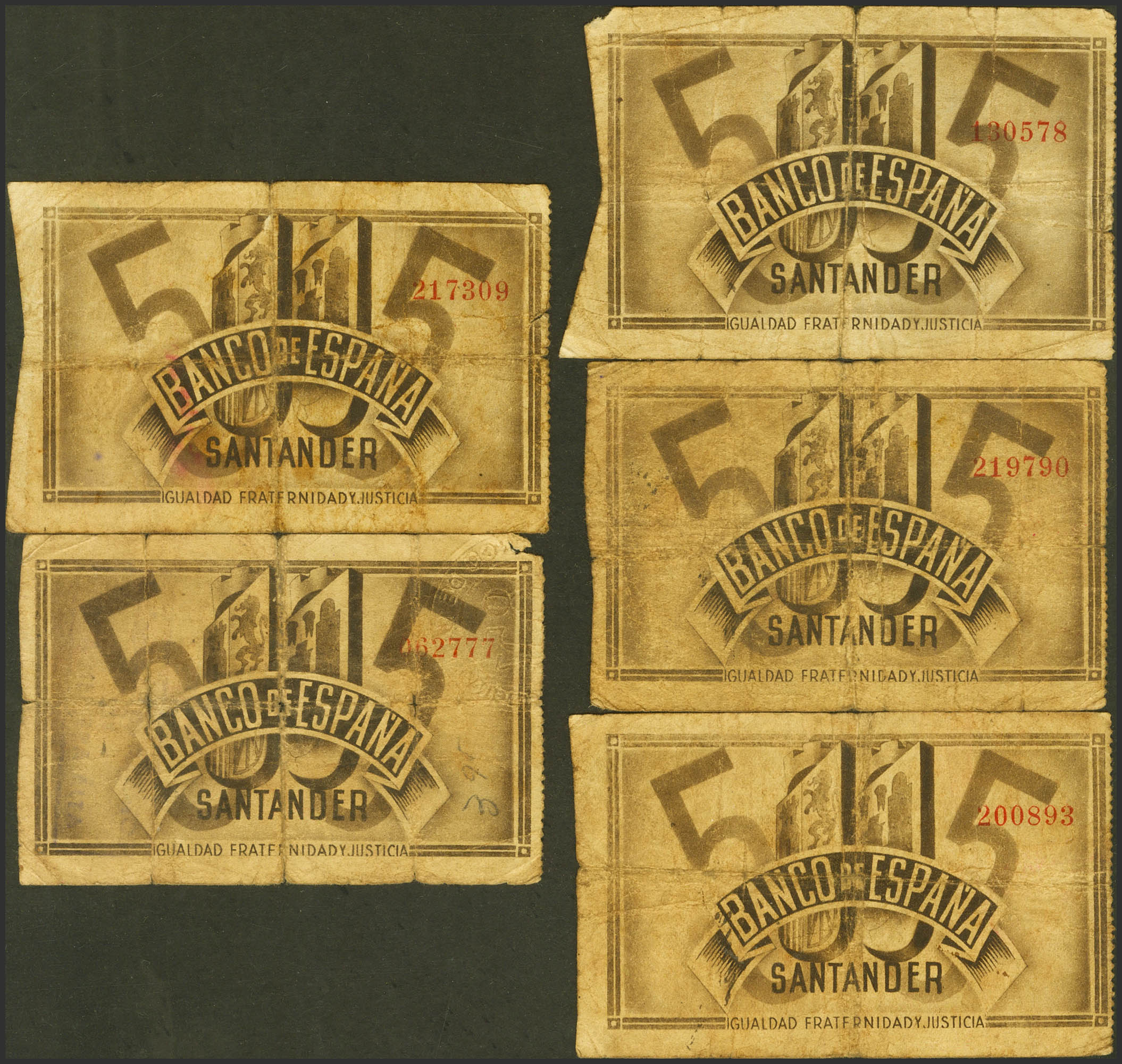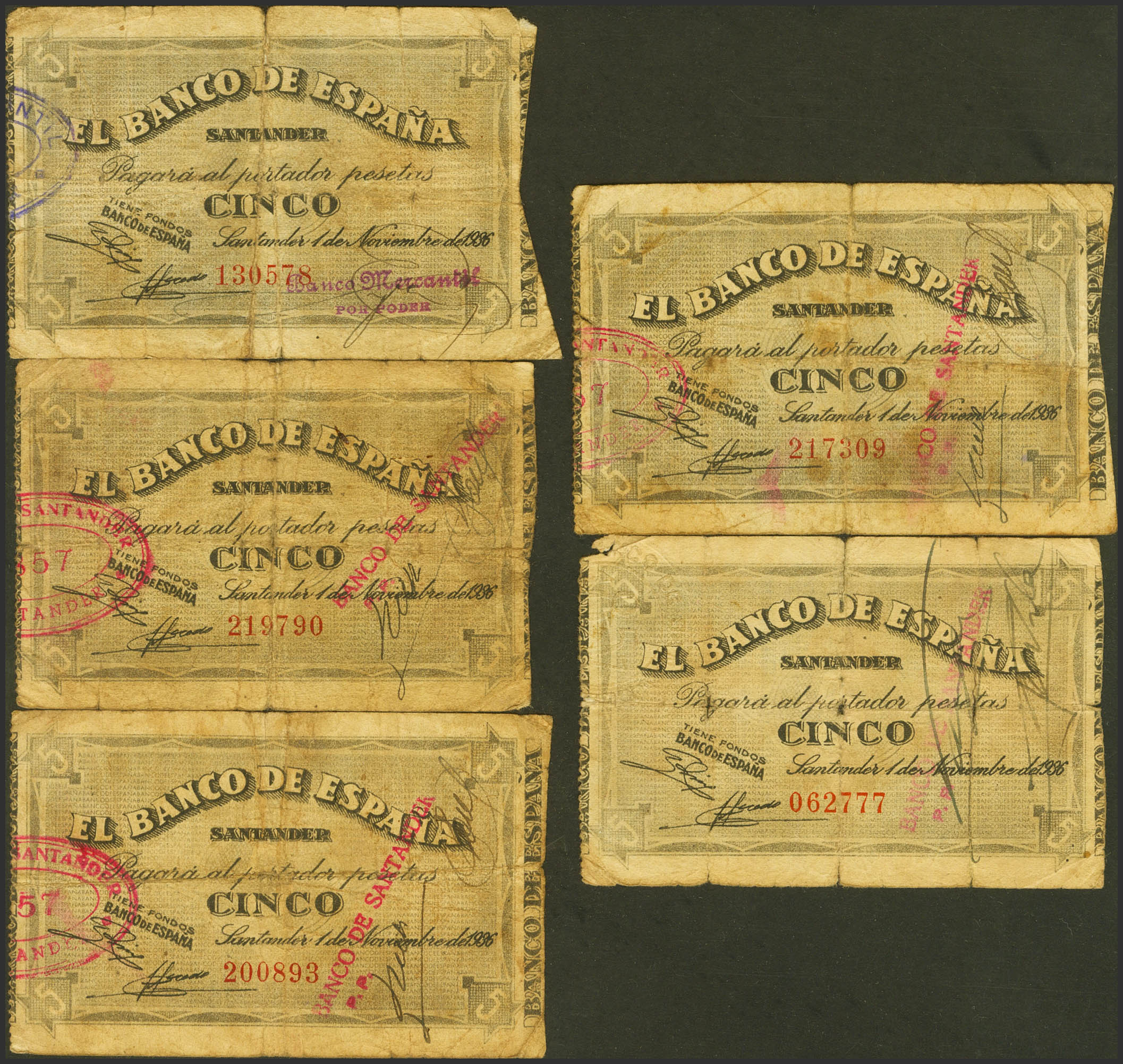Conjunto de 5 billetes de 5 Pesetas del Banco de Santander, emitidos el 1 de Noviembre de 1936, todos ellos sin serie y con diversas antefirmas. (Edifil 2023: 375). MBC-/BC+.