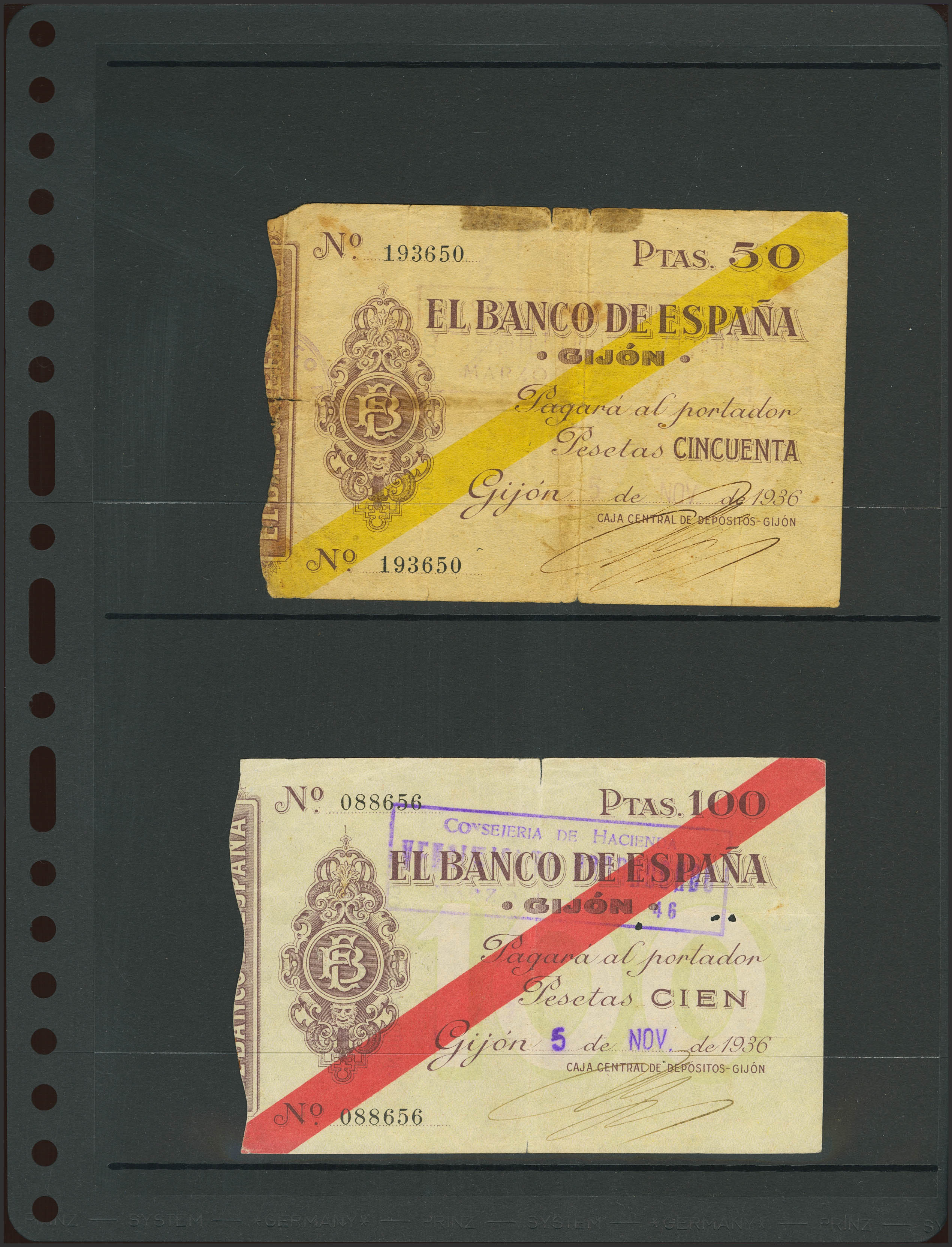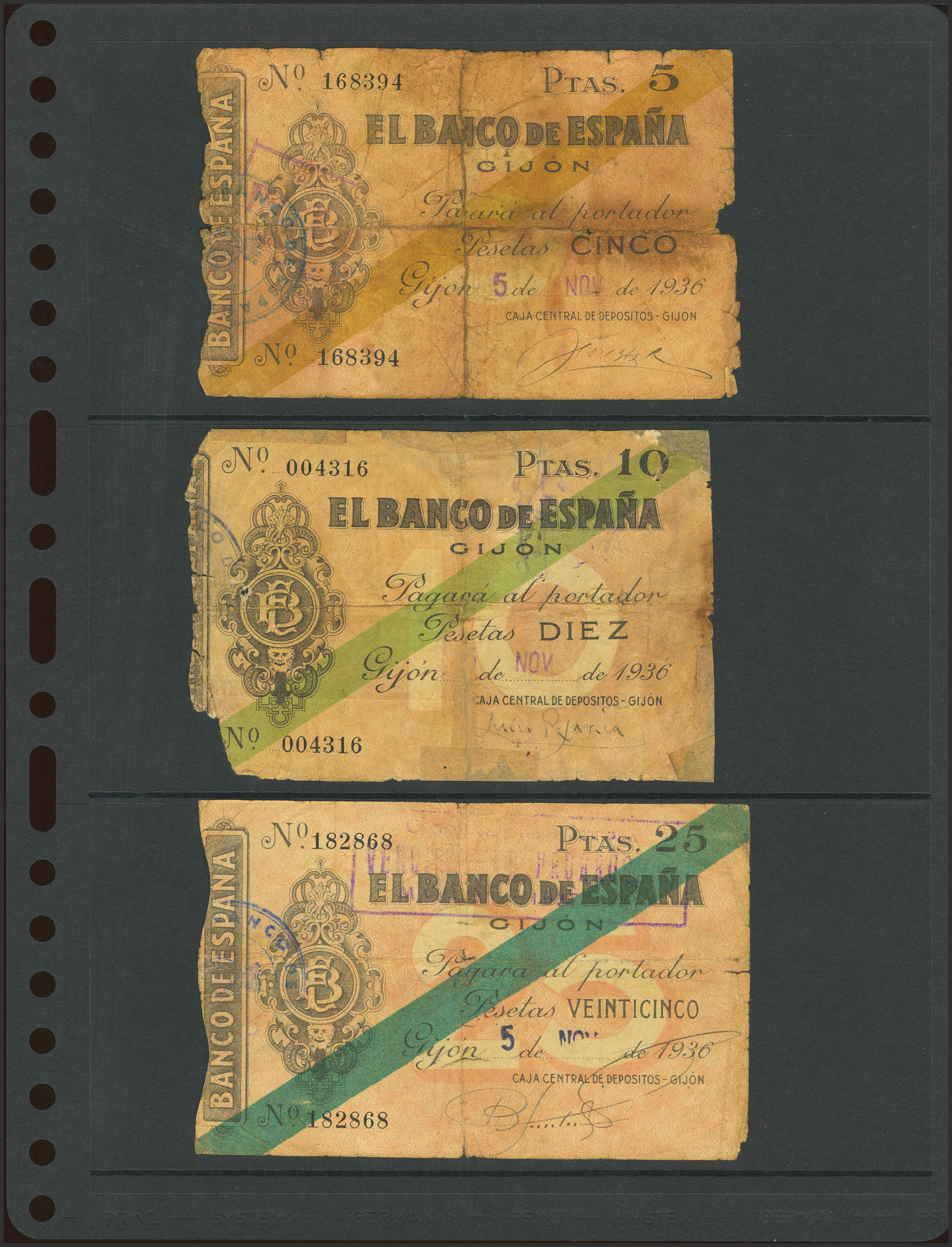 Conjunto de 5 billetes de 5 Pesetas, 10 Pesetas, 25 Pesetas, 50 Pesetas y 100 Pesetas emitidos por el Banco de España en la sucursal de Gijón el 5 de Noviembre de 1936. (Edifil 2023: 380/84). MBC-/RC.