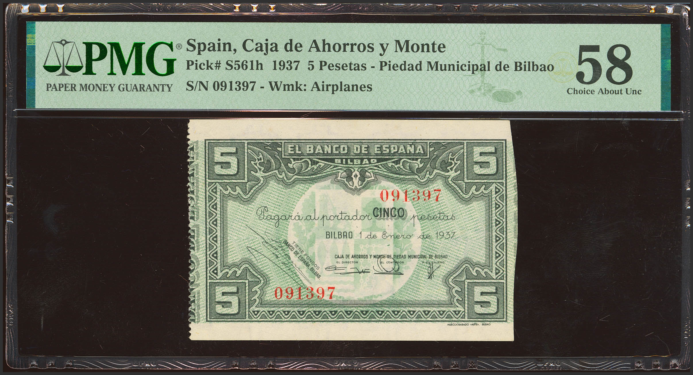 5 Pesetas. 1 de Enero de 1937. Sucursal de Bilbao, antefirma Caja de Ahorros y Monte de Piedad Municipal de Bilbao. Sin serie y sin matrices. (Edifil 2023: 385a, Pick: S561h). EBC++. Encapsulado PMG58.