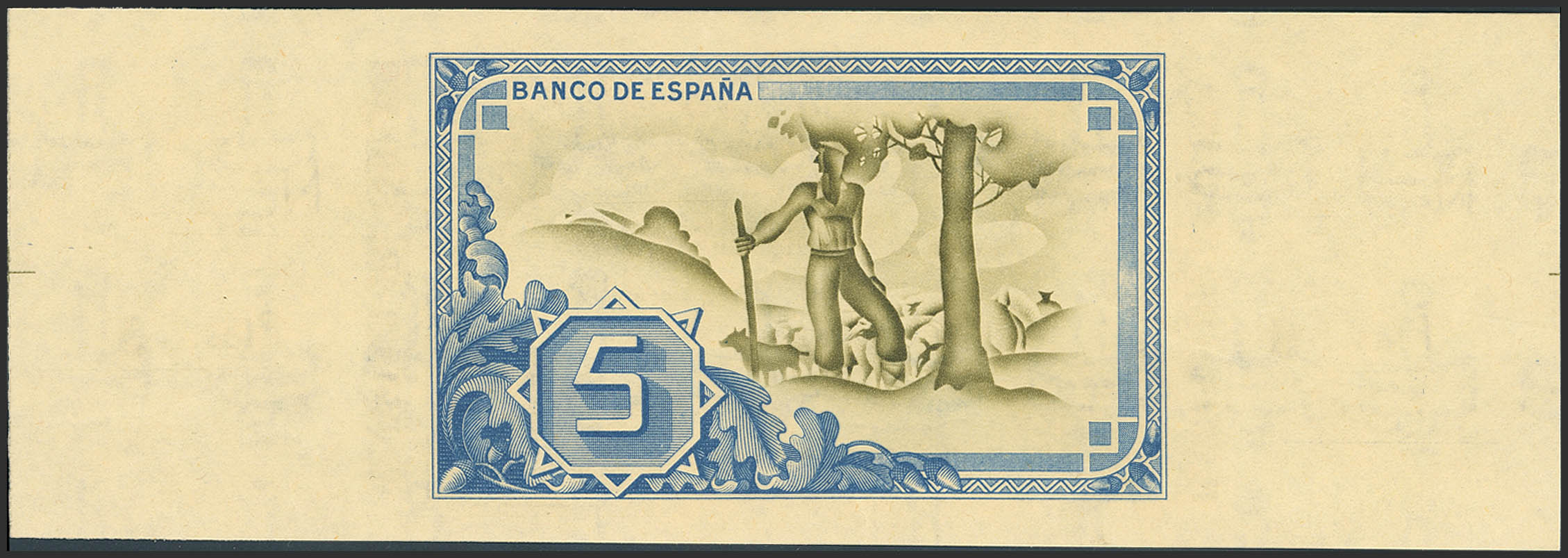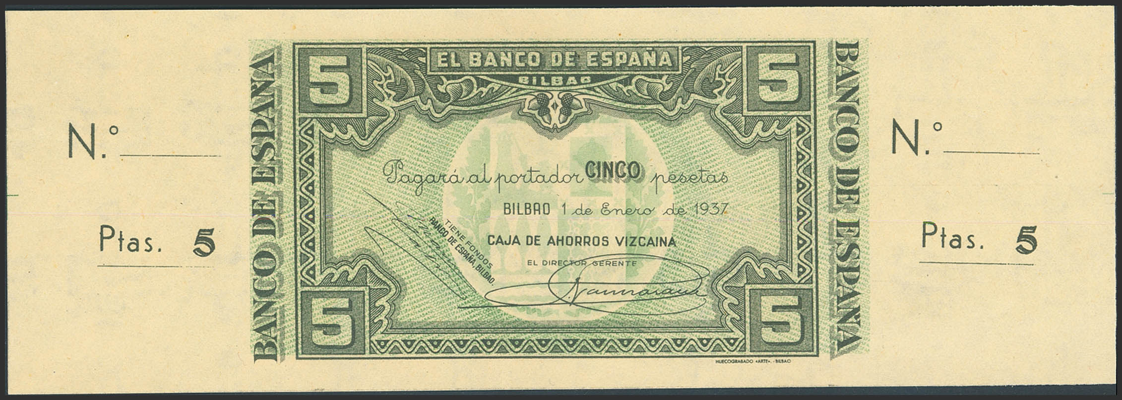 5 Pesetas. 1 de Enero de 1937. Sucursal de Bilbao, antefirma Caja de Ahorros Vizcaína. Sin serie y sin numeración, con ambas matrices. (Edifil 2023: 385b). Apresto original. SC-.