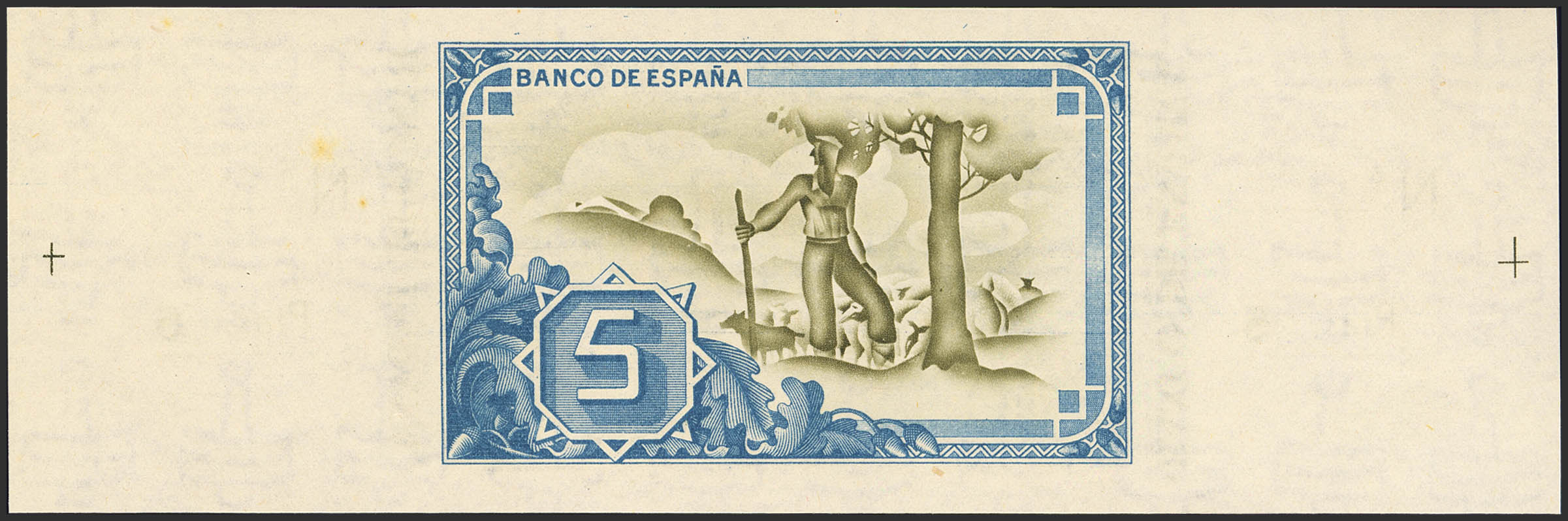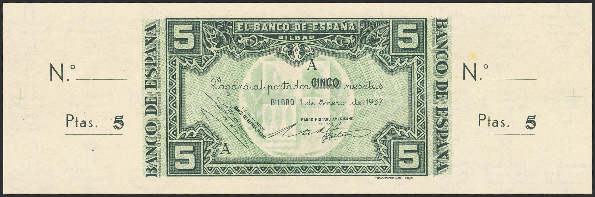 5 Pesetas. 1 de Enero de 1937. Sucursal de Bilbao, antefirma Banco Hispano Americano. Serie A y sin numeración, con ambas matrices. (Edifil 2023: 386a). Apresto original, habituales puntitos del tiempo. SC.