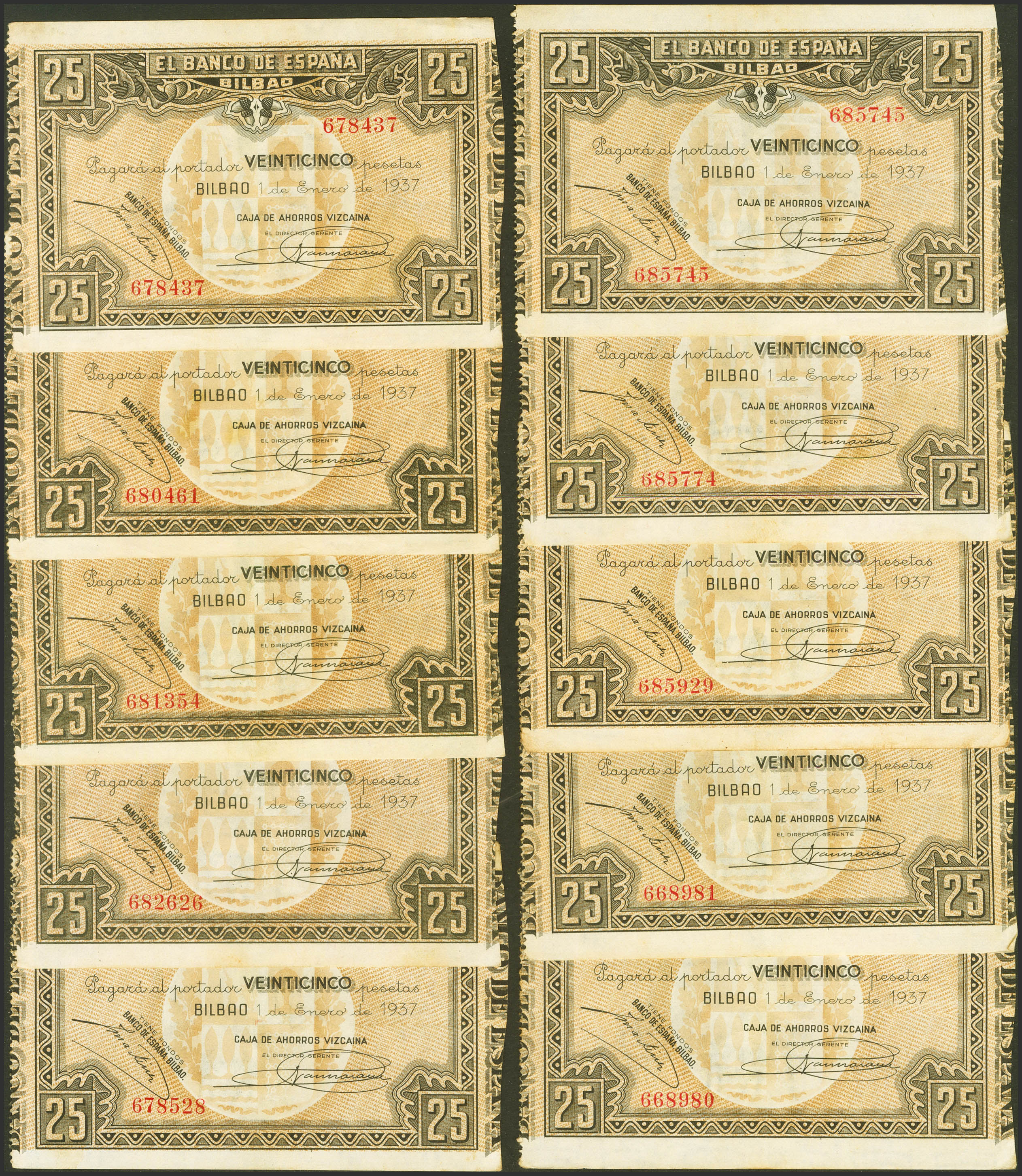 Conjunto de 10 billetes de 25 Pesetas del Banco de Bilbao, emitidos el 1 de Enero de 1937, todos ellos sin serie y con diversas antefirmas. (Edifil 2023: 388). EBC/EBC-.