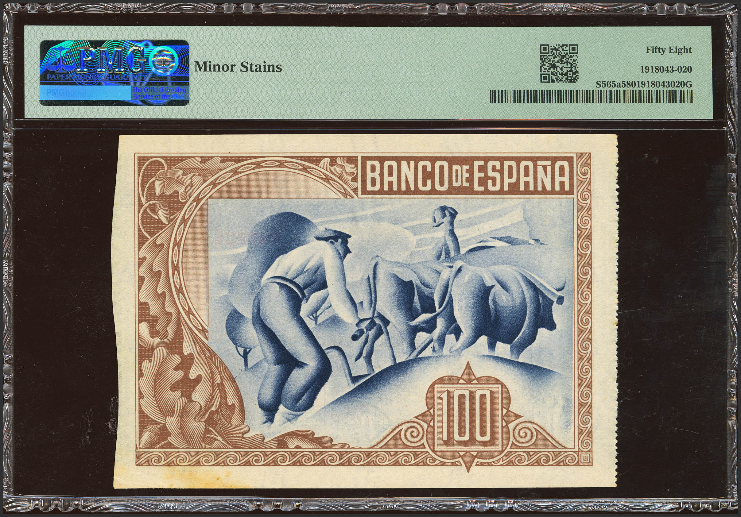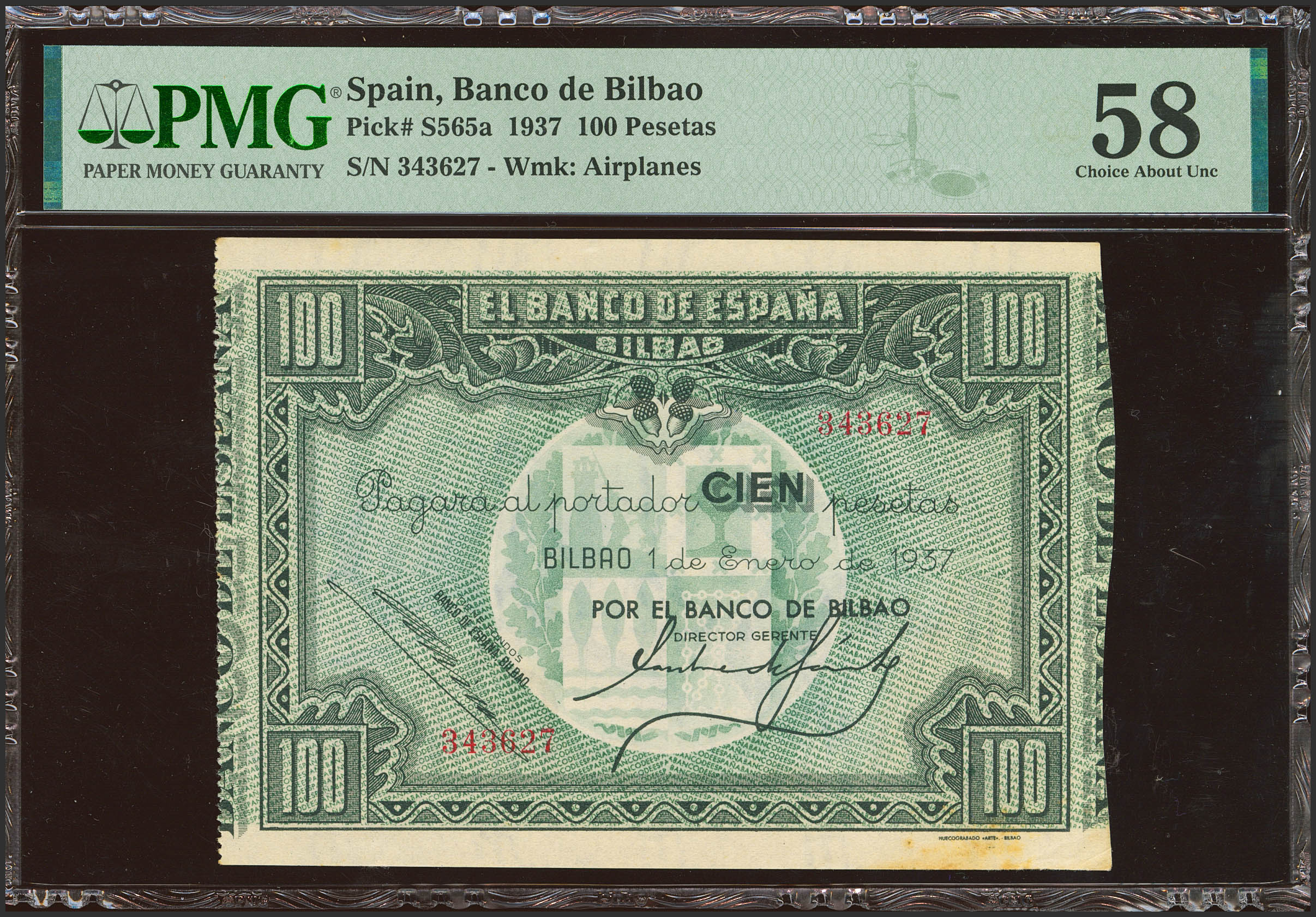 100 Pesetas. 1 de Enero de 1937. Sucursal de Bilbao, antefirma Banco de Bilbao. (Edifil 2023: 390a, Pick: S565a). Raro en esta excepcional calidad, manchitas del tiempo habituales. EBC++. Encapsulado PMG58 (minor stains).