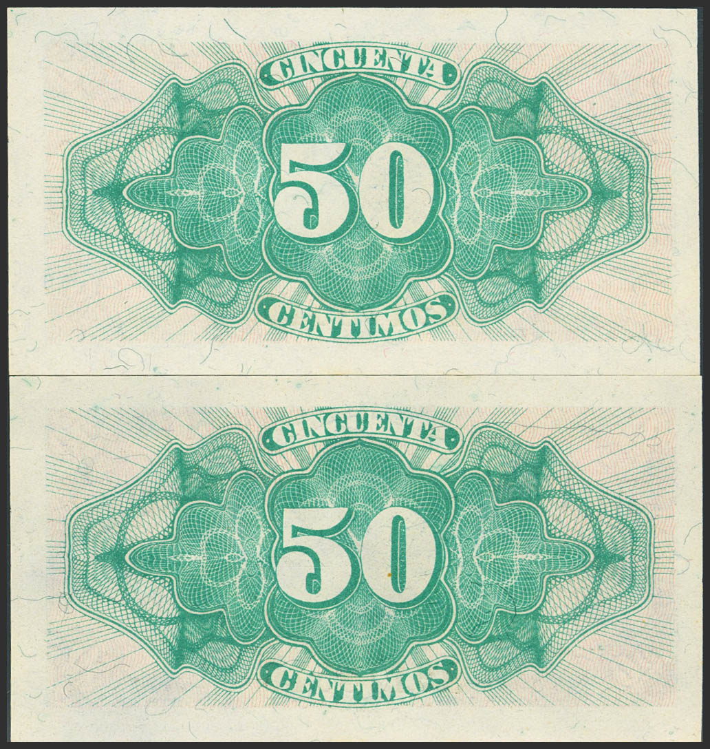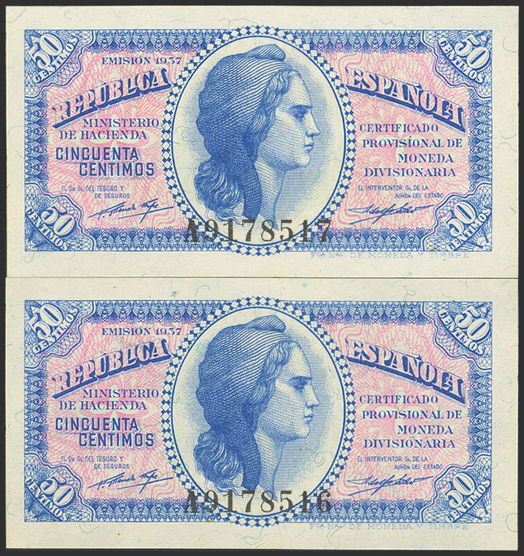 50 Céntimos. 1937. Pareja correlativa. Serie A. (Edifil 2023: 391). Apresto original. SC.