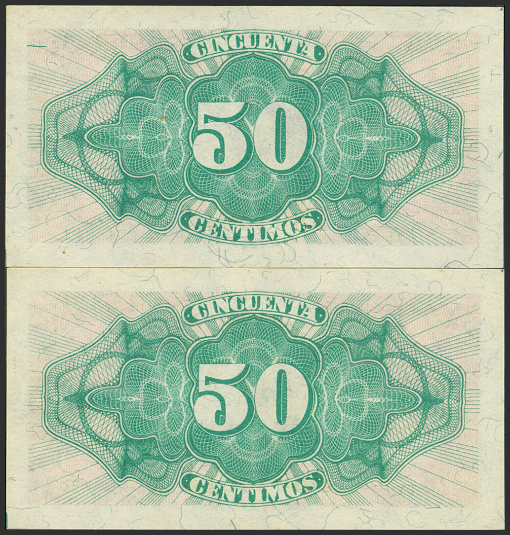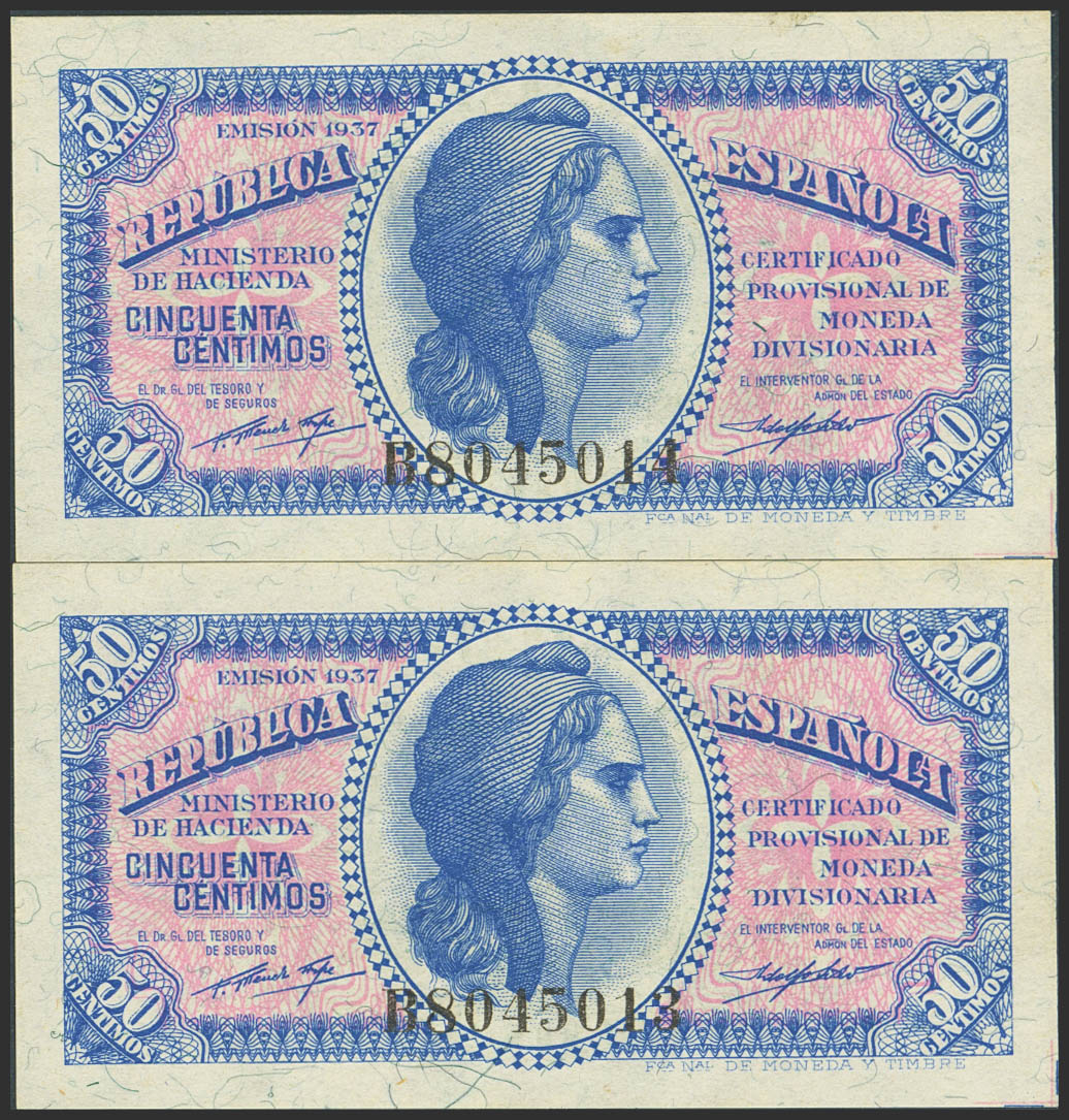 50 Céntimos. 1937. Pareja correlativa. Serie B. (Edifil 2023: 391). Apresto original. SC.