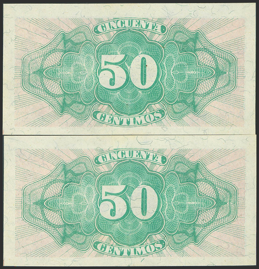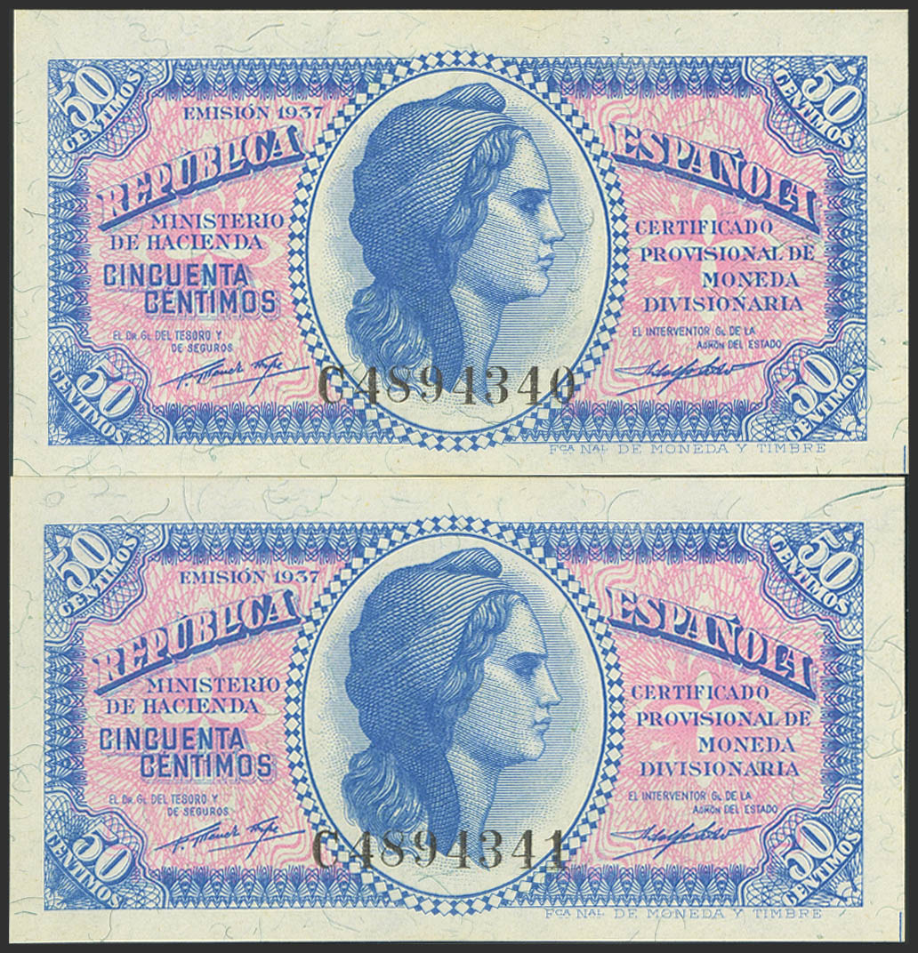 50 Céntimos. 1937. Pareja correlativa. Serie C, última serie emitida. (Edifil 2023: 391a). Apresto original. SC.