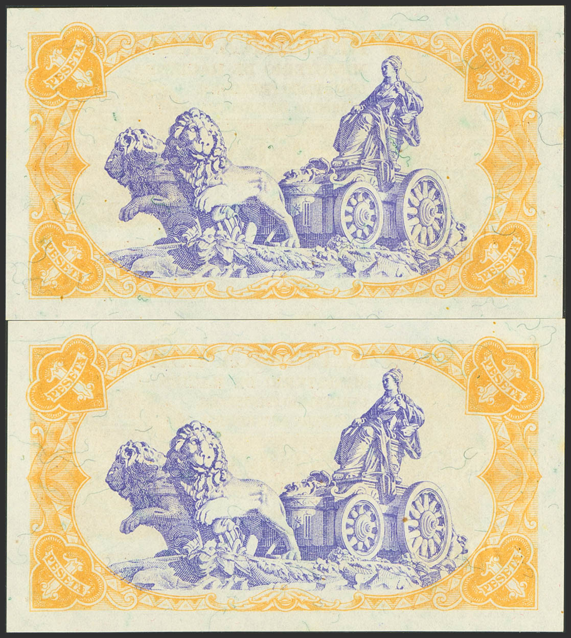 1 Peseta. 1937. Pareja correlativa. Serie A. (Edifil 2023: 392). Apresto original, habituales puntitos del tiempo. SC.