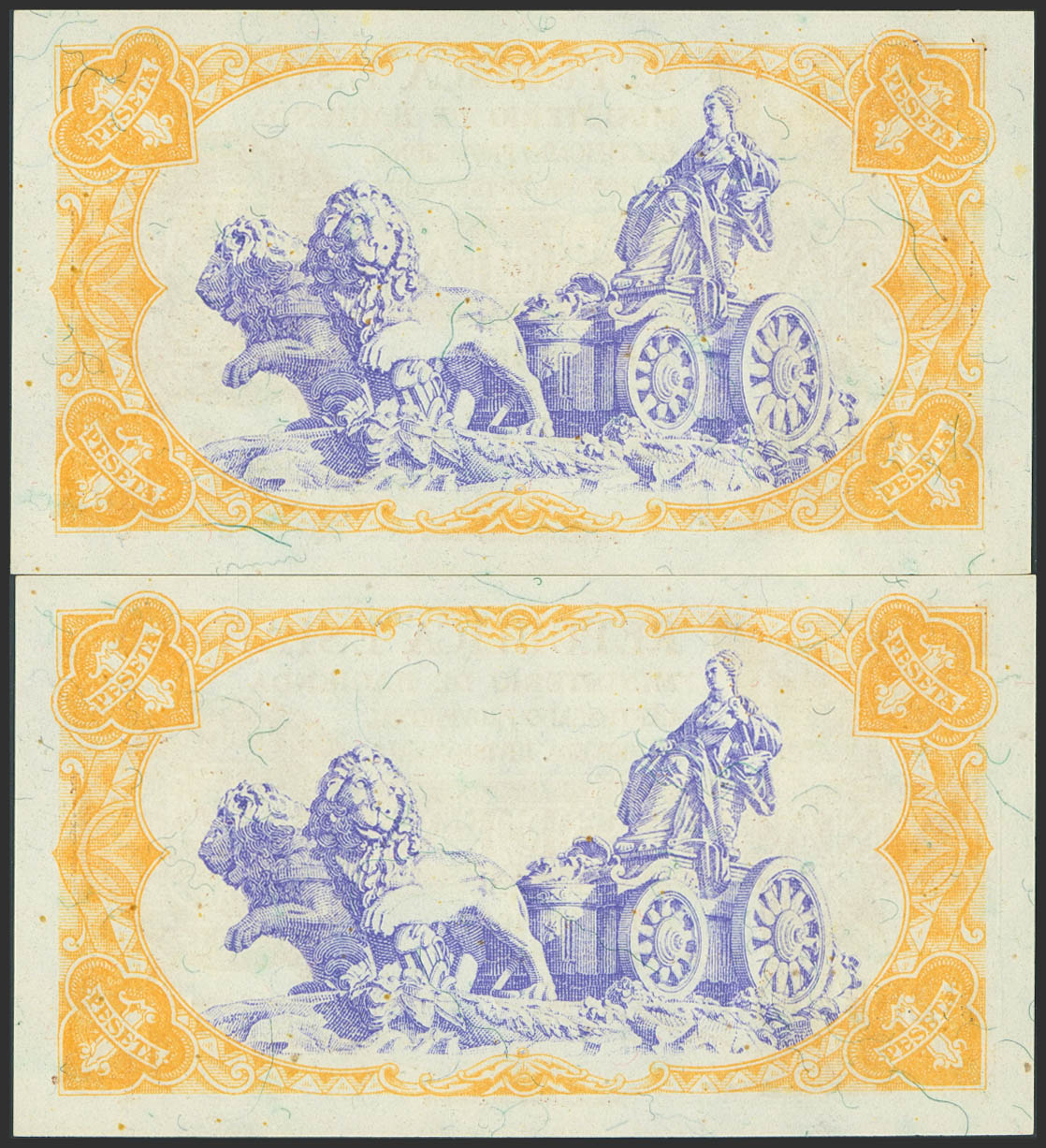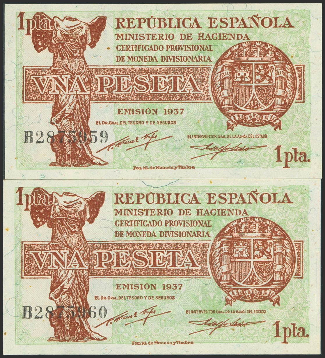 1 Peseta. 1937. Pareja correlativa. Serie B. (Edifil 2023: 392). Apresto original, habituales puntitos del tiempo. SC.