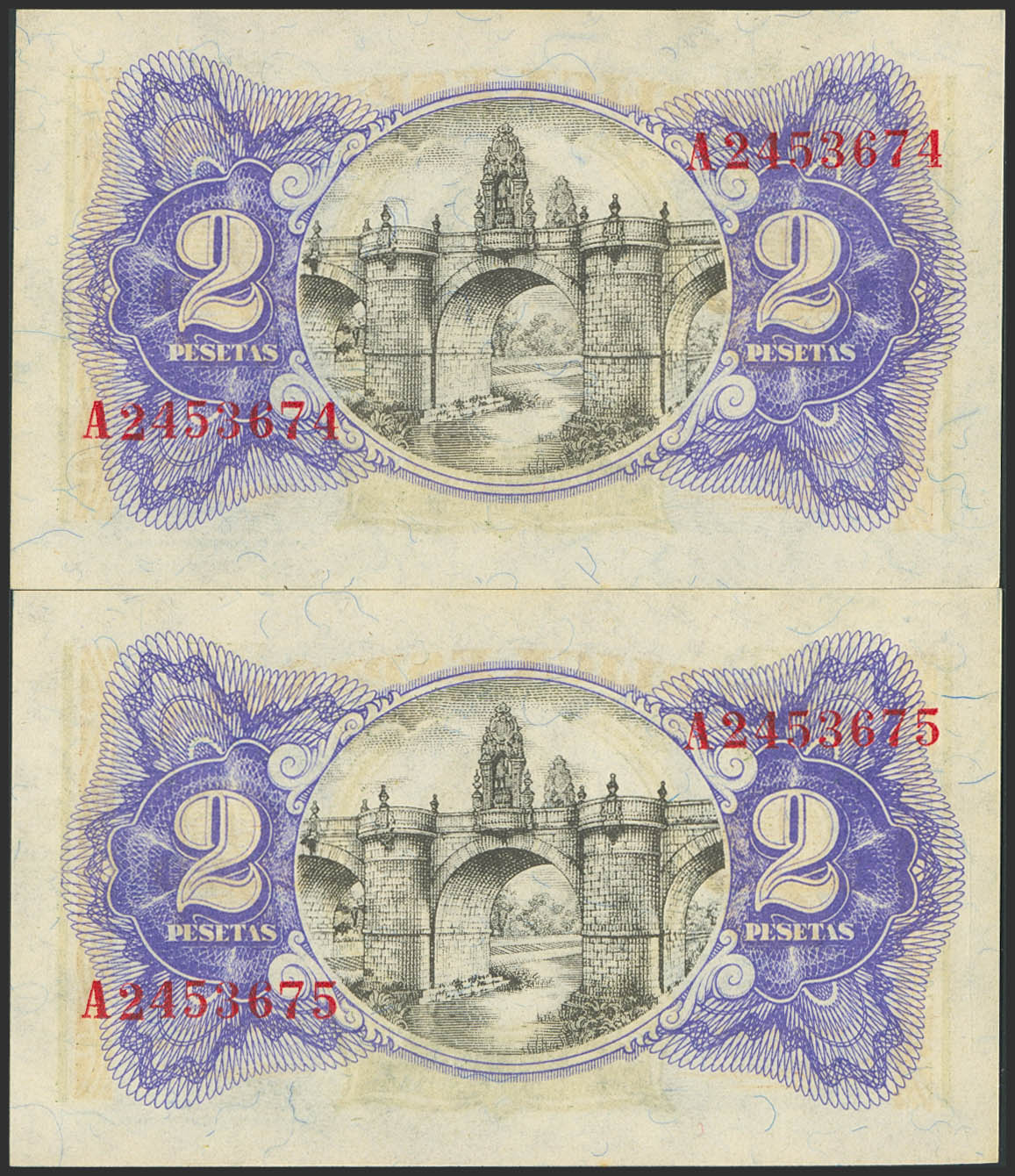 2 Pesetas. 1938. Pareja correlativa. Serie A. (Edifil 2023: 393). Apresto original. SC.