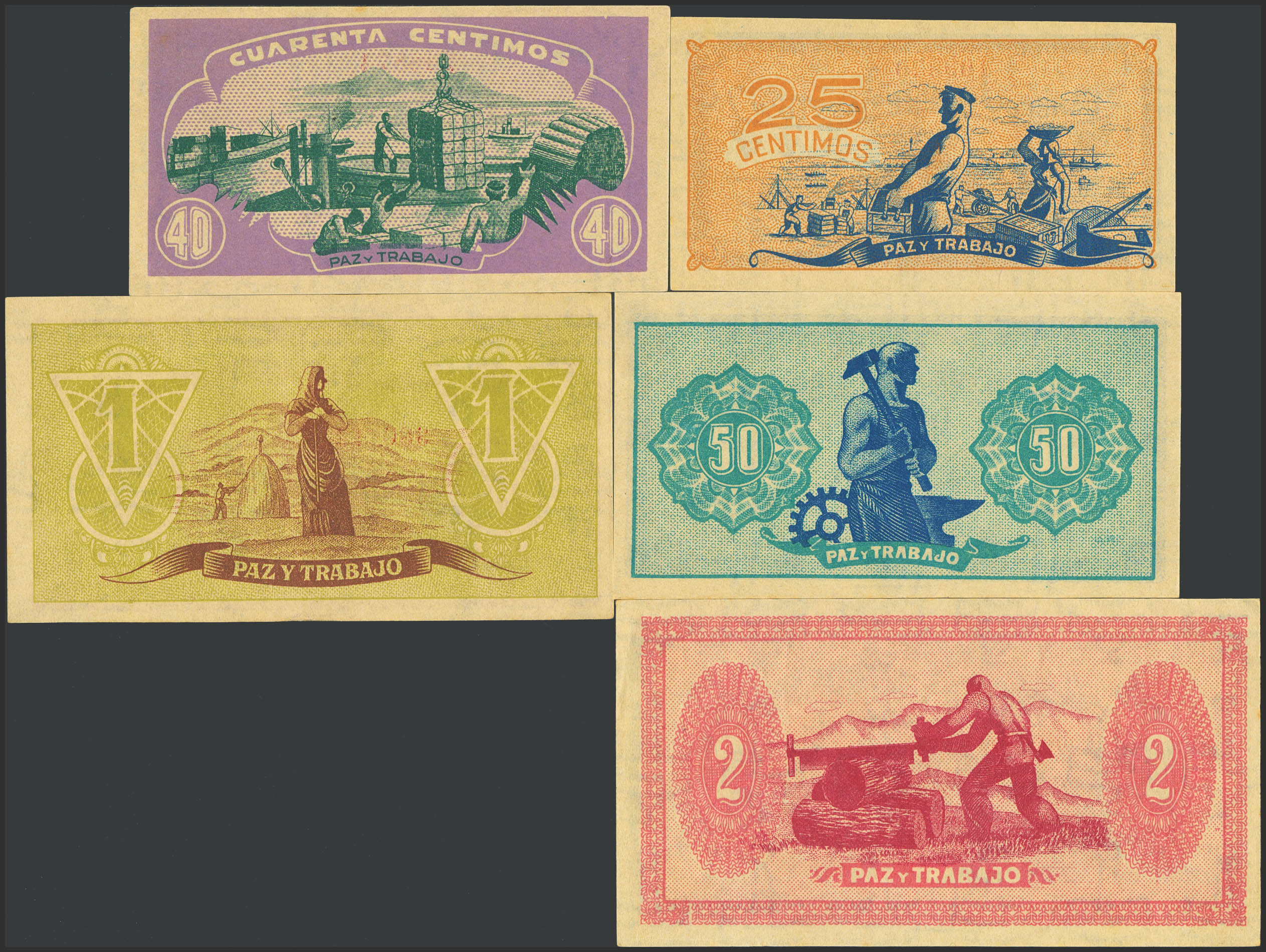 Serie completa incluyendo el 25 Céntimos, 40 Céntimos, 50 Céntimos, 1 Peseta y 2 Pesetas de 1937 de Asturias y León, todos ellos sin serie. (Edifil 2023: 394/98). Raro en esta excepcional calidad. SC/SC-.