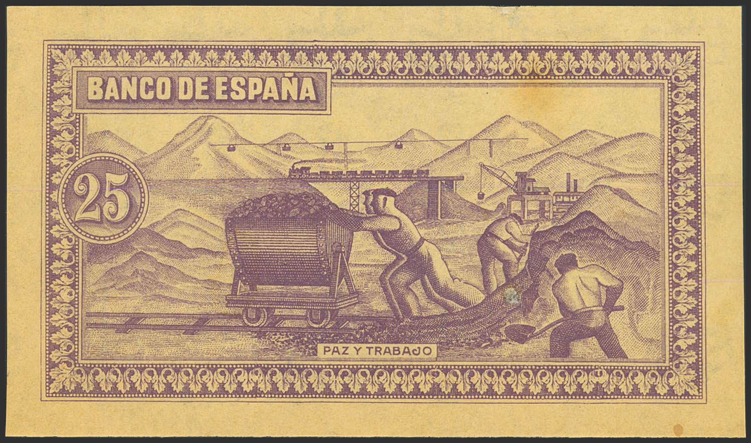25 Pesetas. Septiembre 1937. No Emitido (de este valor sólo se conoce el reverso). Sucursal de Gijón. (Edifil 2023: NE29P). Inusual, manchitas del tiempo habituales. SC--.