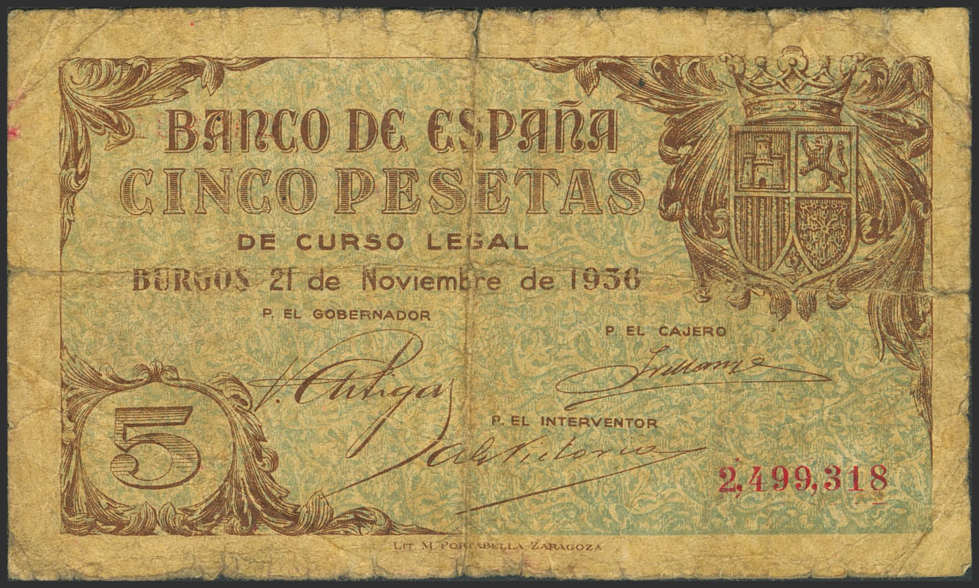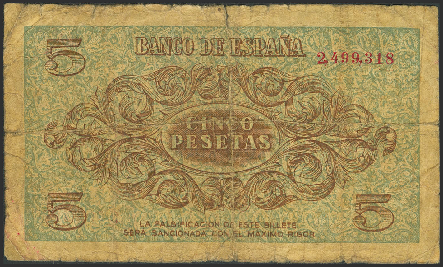 5 Pesetas. 21 de Noviembre de 1936. Sin serie. (Edifil 2023: 417). BC-.