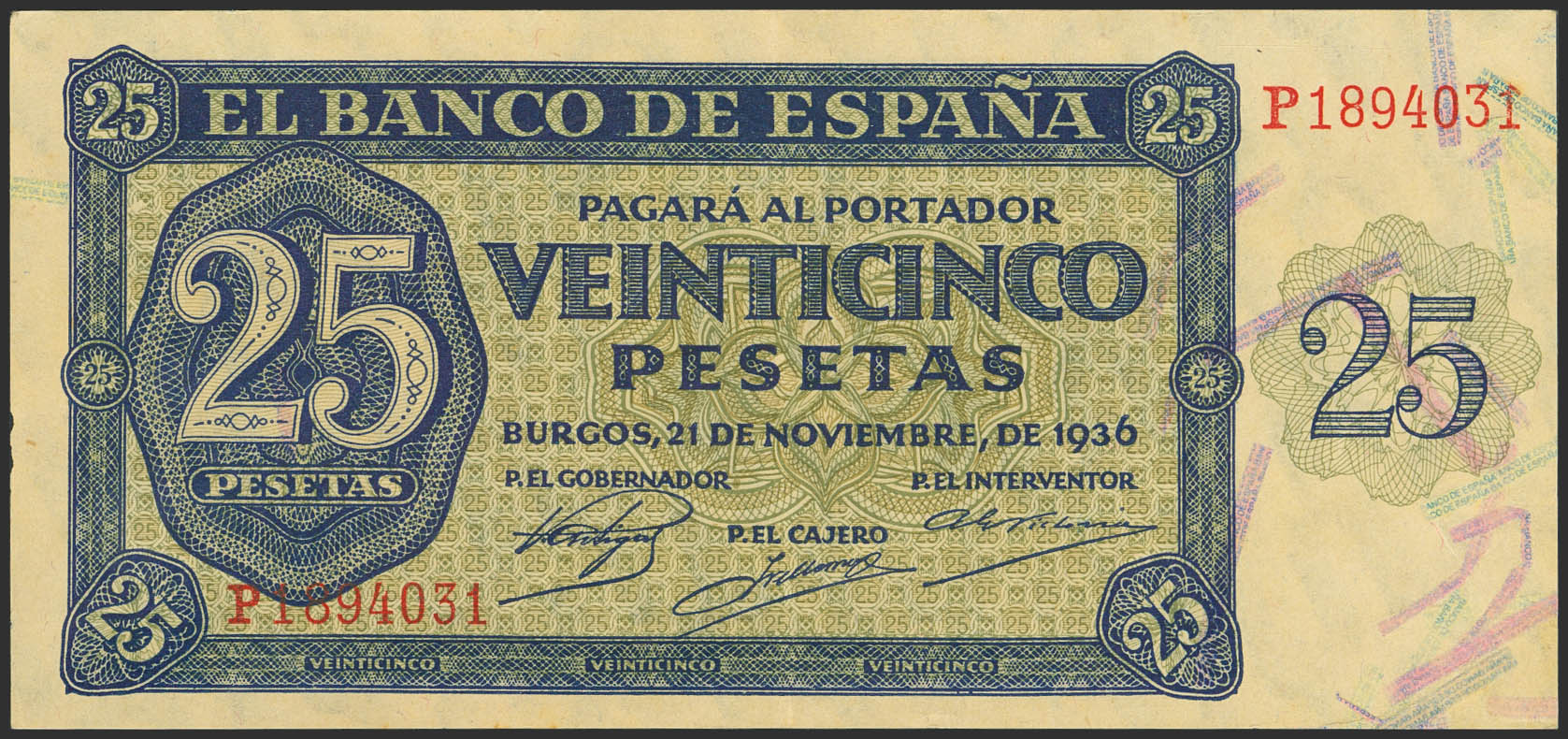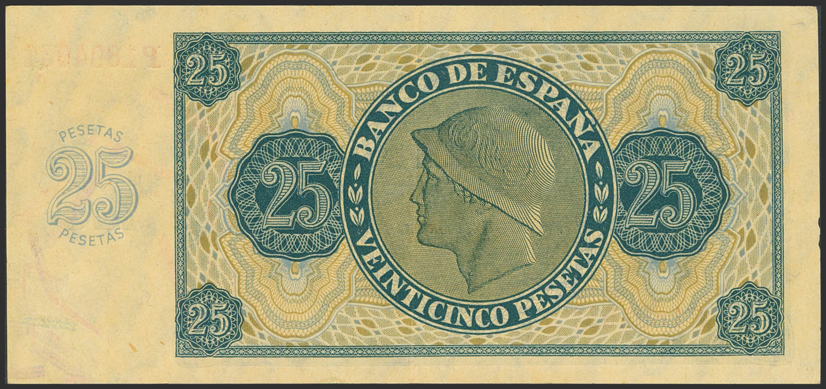 25 Pesetas. 21 de Noviembre de 1936. Serie P. (Edifil 2023: 419a). Conserva gran parte de su apresto. EBC.