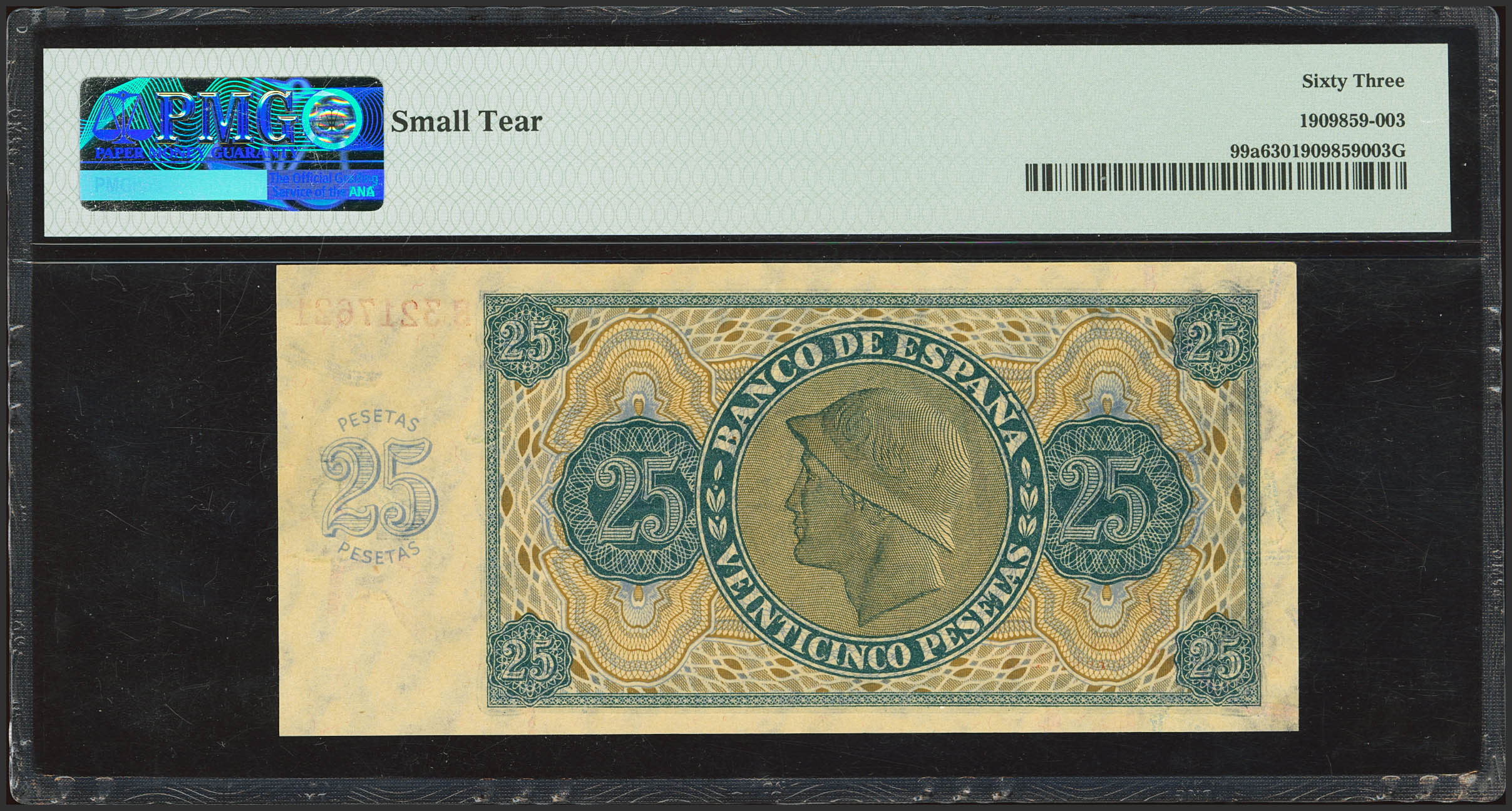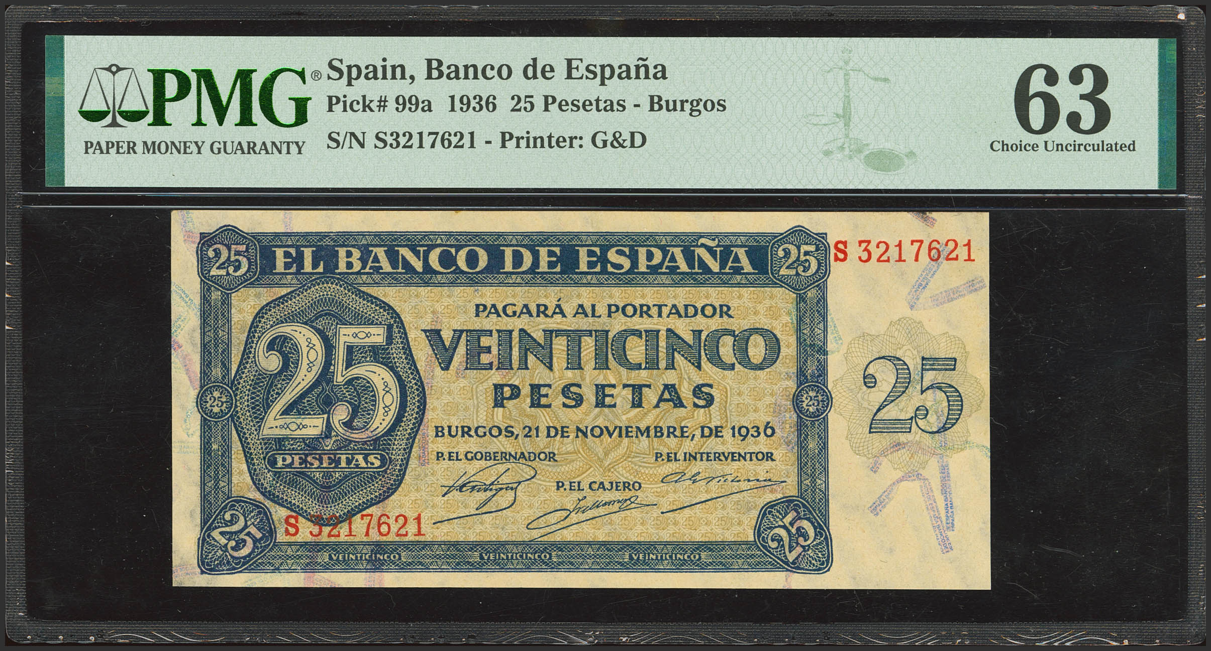 25 Pesetas. 21 de Noviembre de 1936. Serie S, última serie emitida. (Edifil 2023: 419b, Pick: 99a). SC-. Encapsulado PMG63 (small tear).