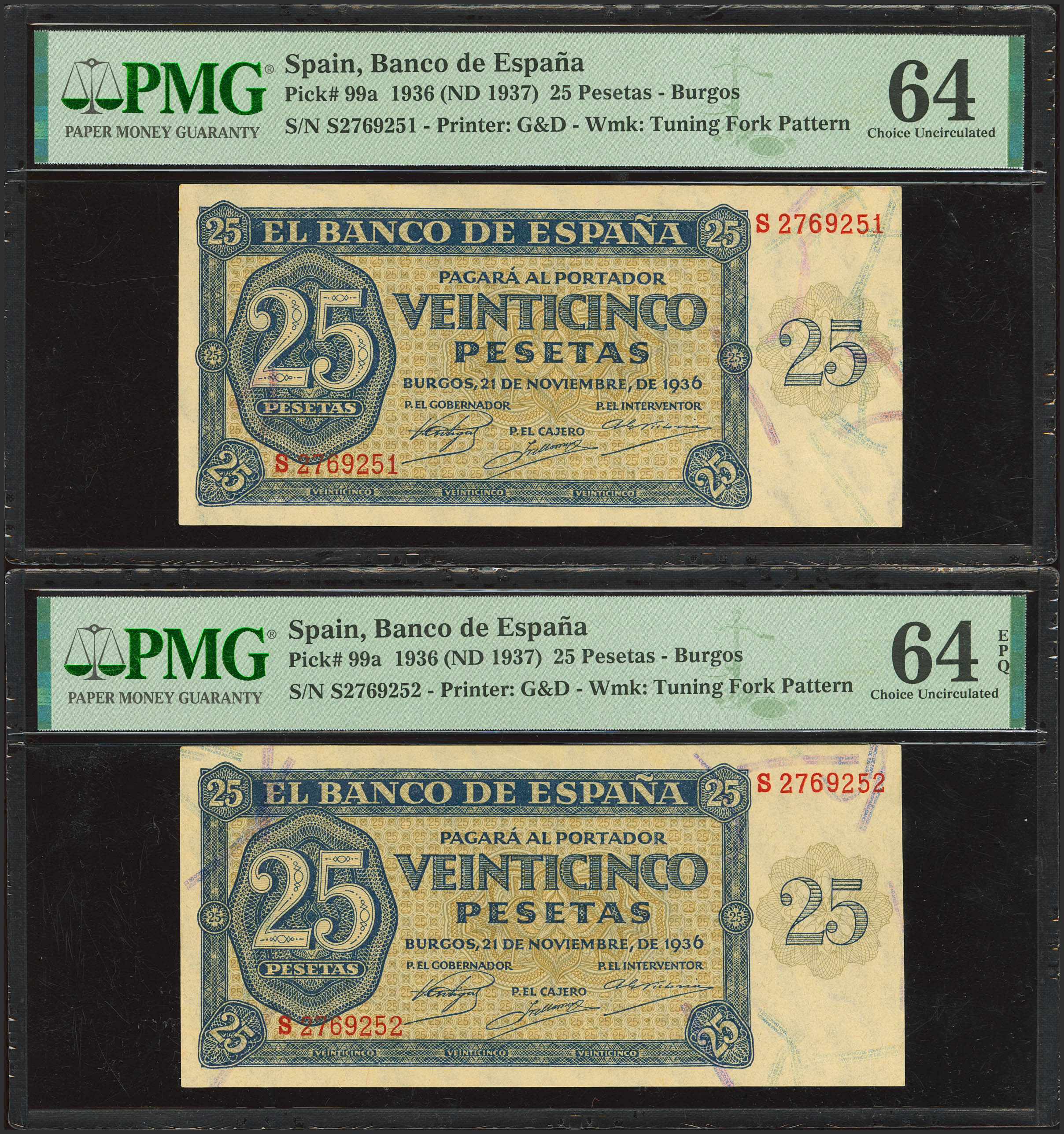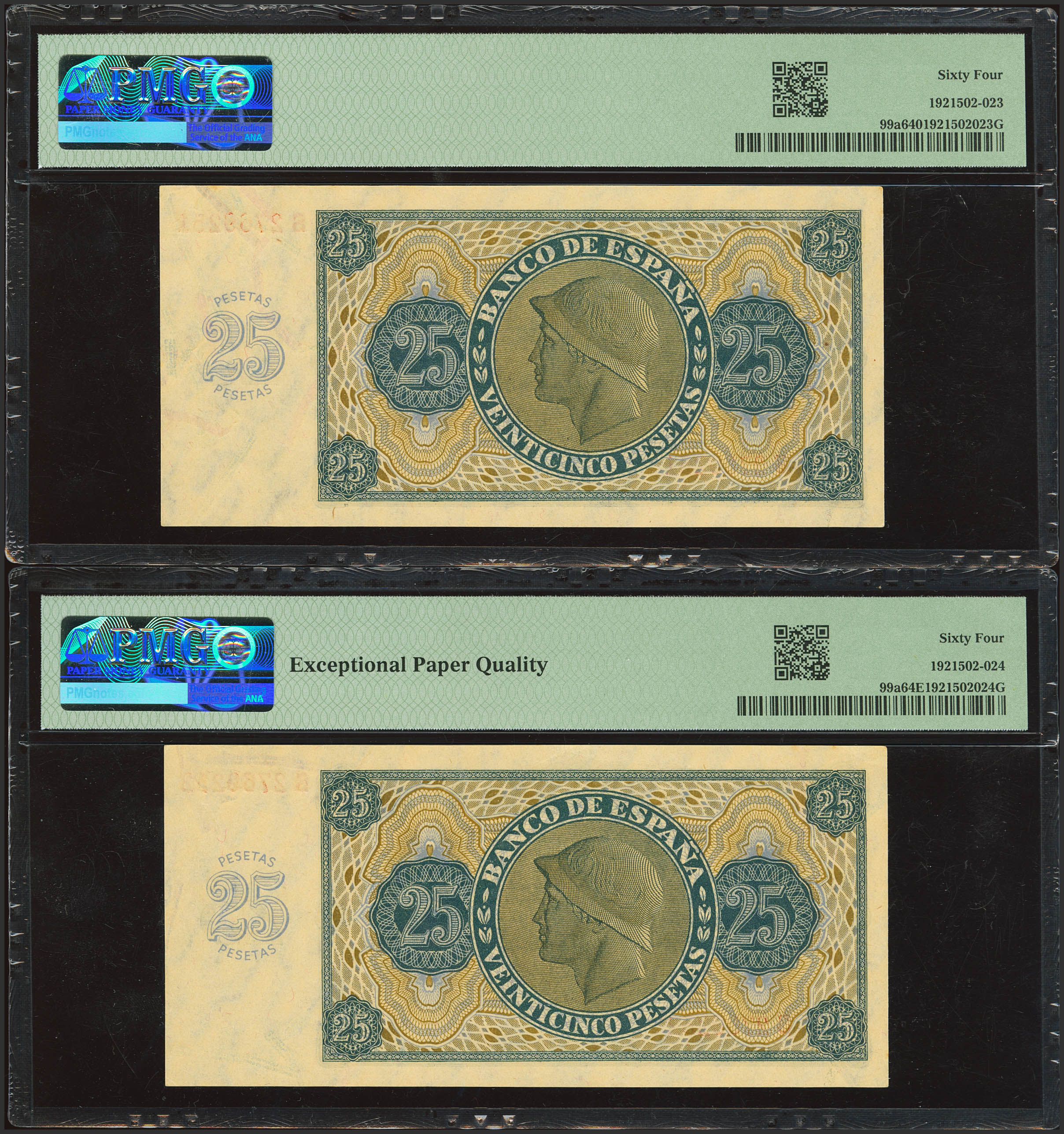 25 Pesetas. 21 de Noviembre de 1936. Pareja correlativa. Serie S, última serie emitida. (Edifil 2023: 419b, Pick: 99a). Apresto original. SC. Encapsulados PMG64/64EPQ.