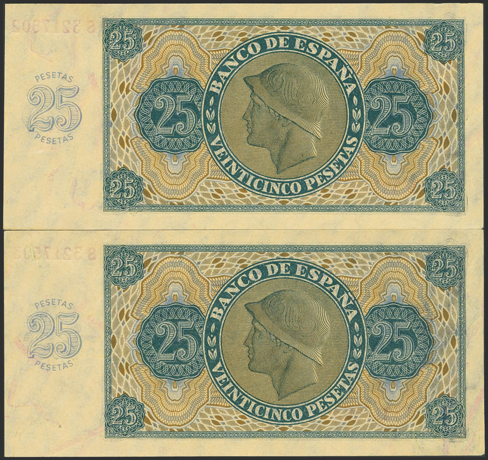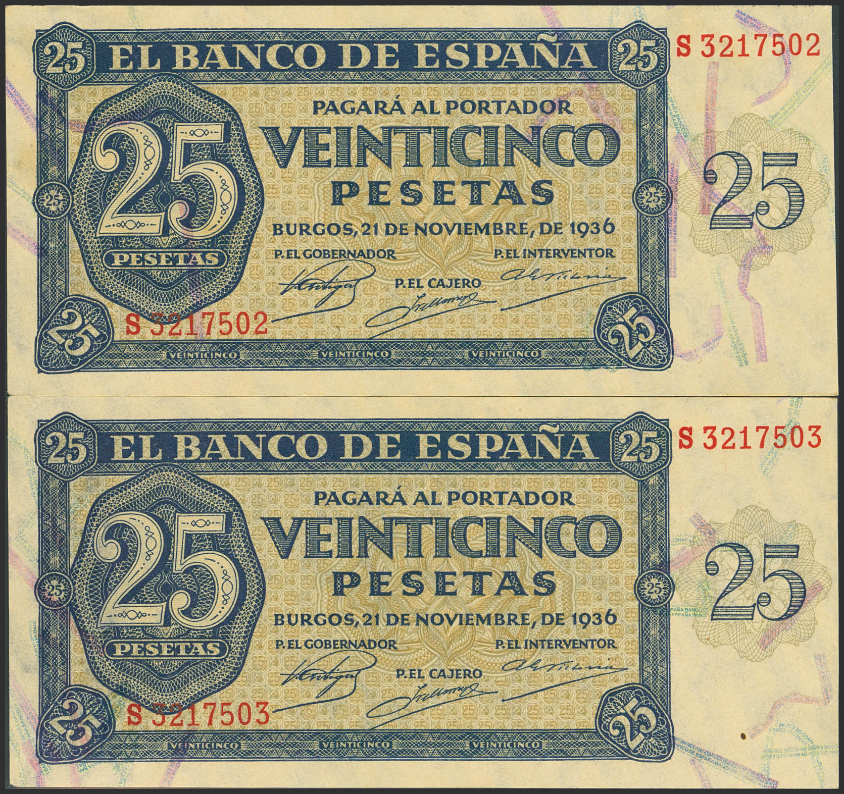 25 Pesetas. 21 de Noviembre de 1936. Pareja correlativa. Serie S, última serie emitida. (Edifil 2023: 419b). Apresto original. SC.