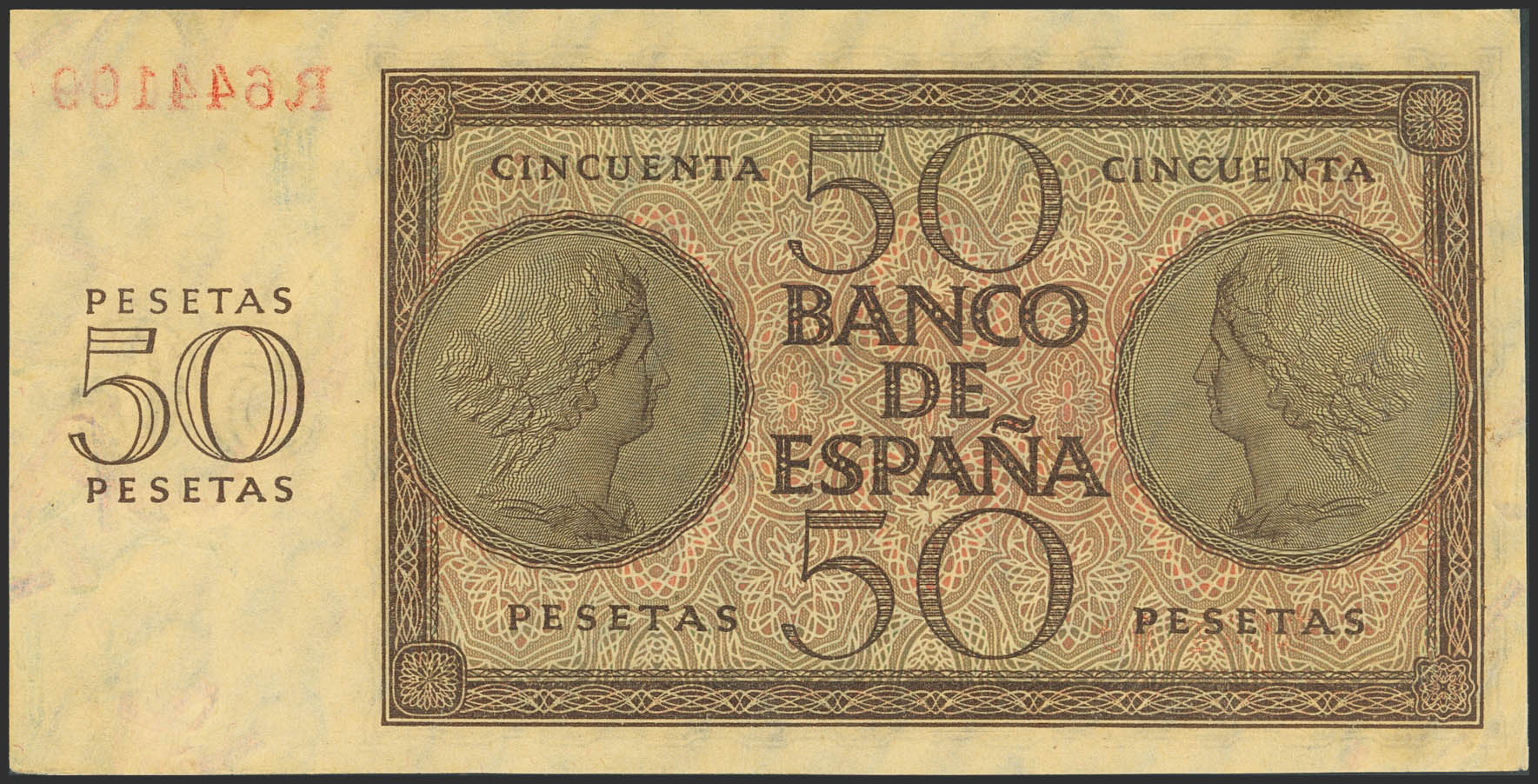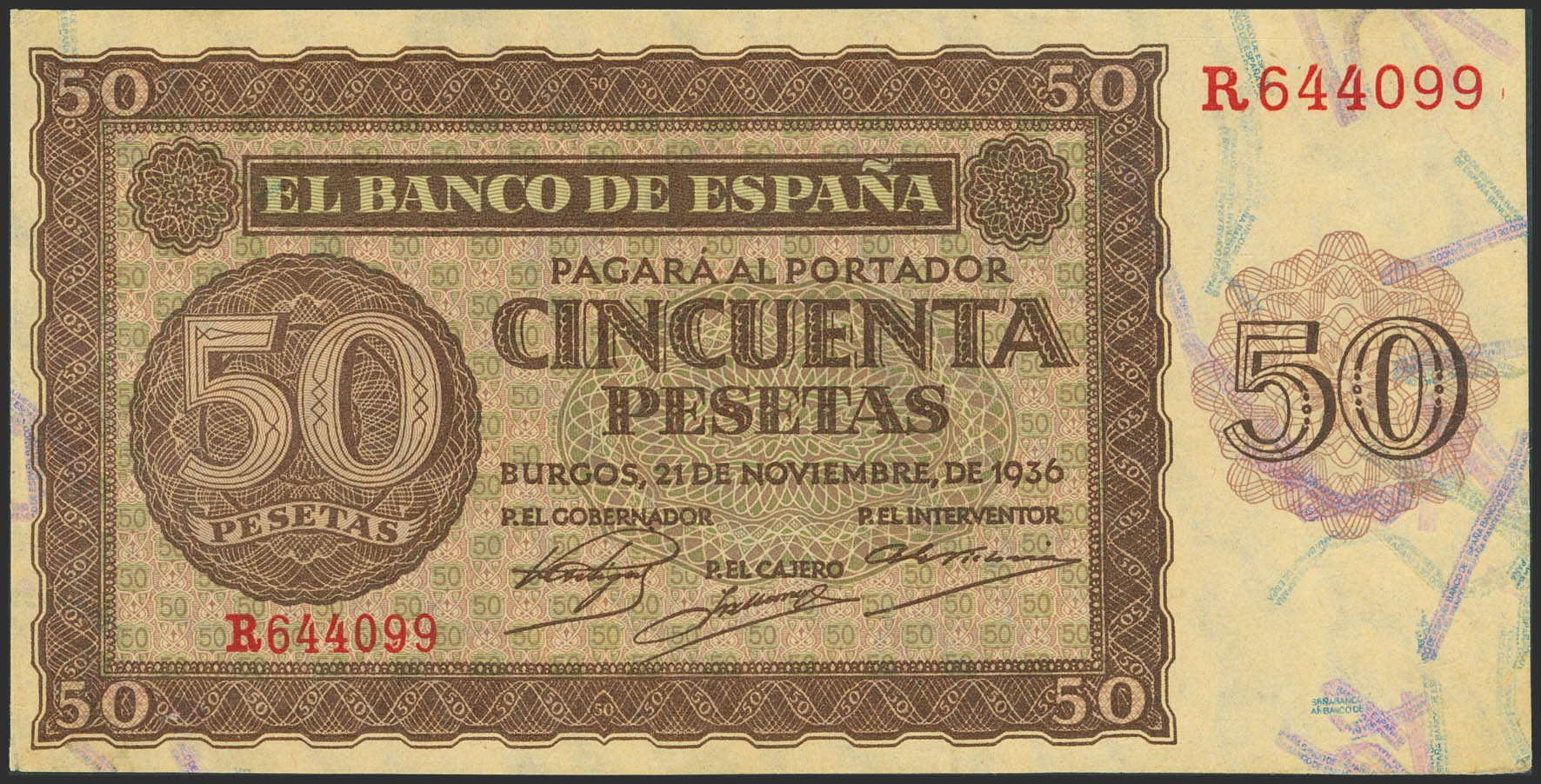 50 Pesetas. 21 de Noviembre de 1936. Serie R. (Edifil 2023: 420a). Apresto original. EBC+++.