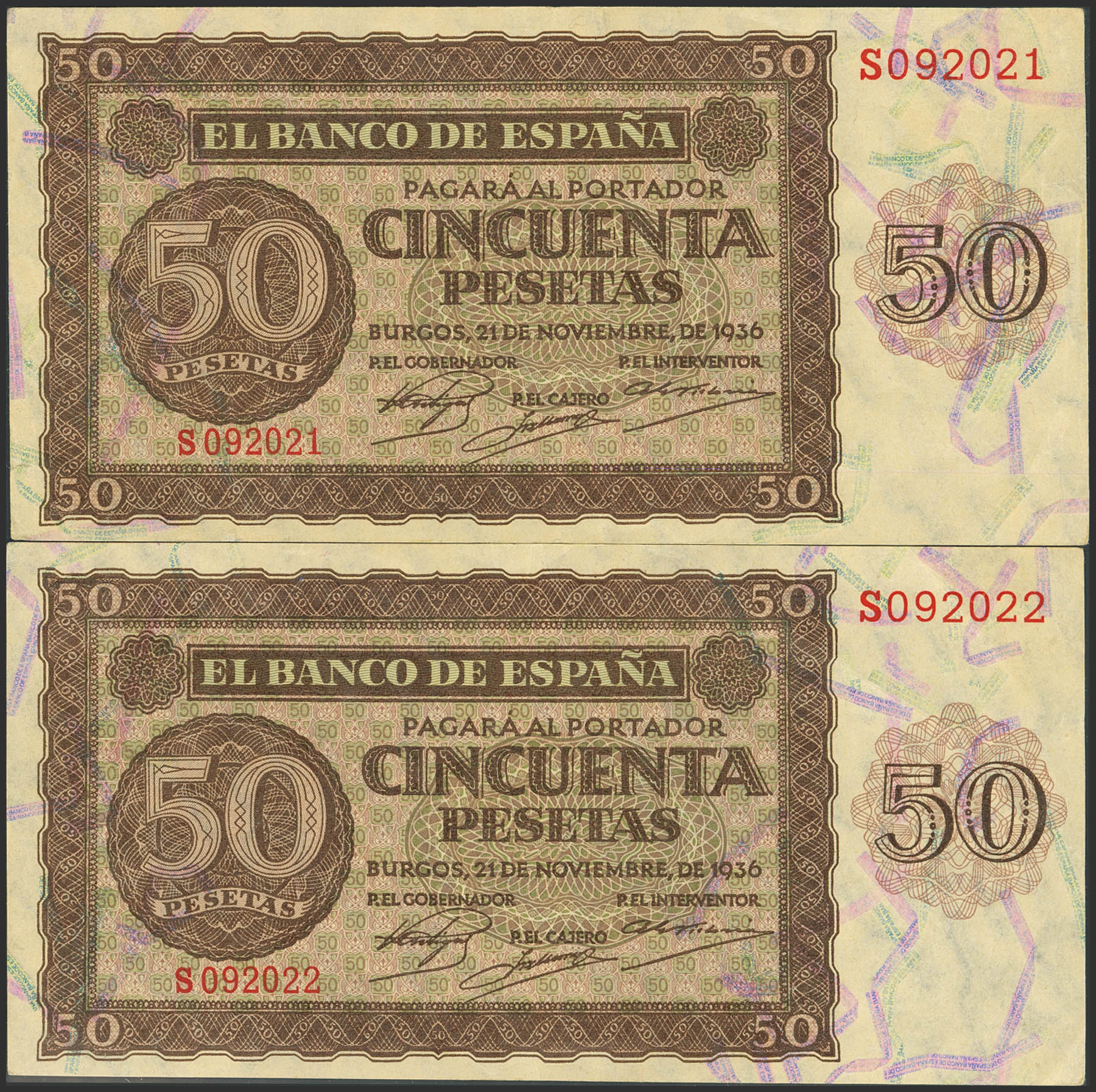 50 Pesetas. 21 de Noviembre de 1936. Pareja correlativa. Serie S, última serie emitida. (Edifil 2023: 420b). Rarísima pareja, conserva gran parte de su apresto original. EBC+.