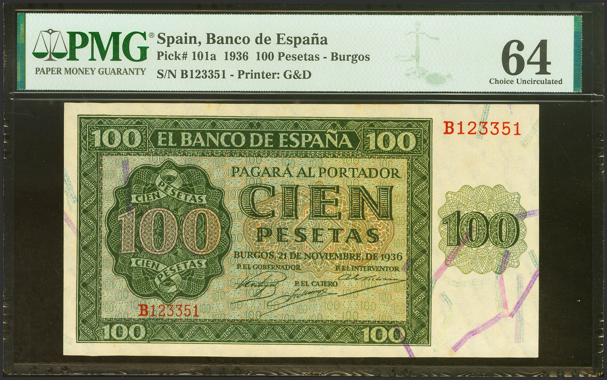 100 Pesetas. 21 de Noviembre de 1936. Serie B. (Edifil 2023: 421a, Pick: 101a). SC. Encapsulado PMG64.
