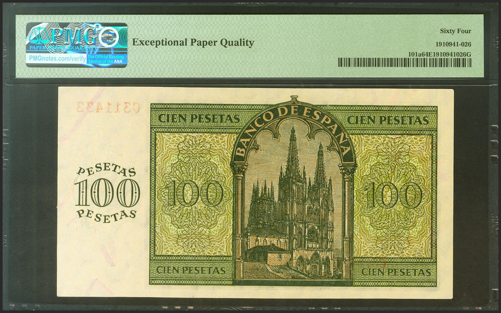 100 Pesetas. 21 de Noviembre de 1936. Serie C. (Edifil 2021: 421a, Pick: 101a). Apresto original. SC. Encapsulado PMG64EPQ.