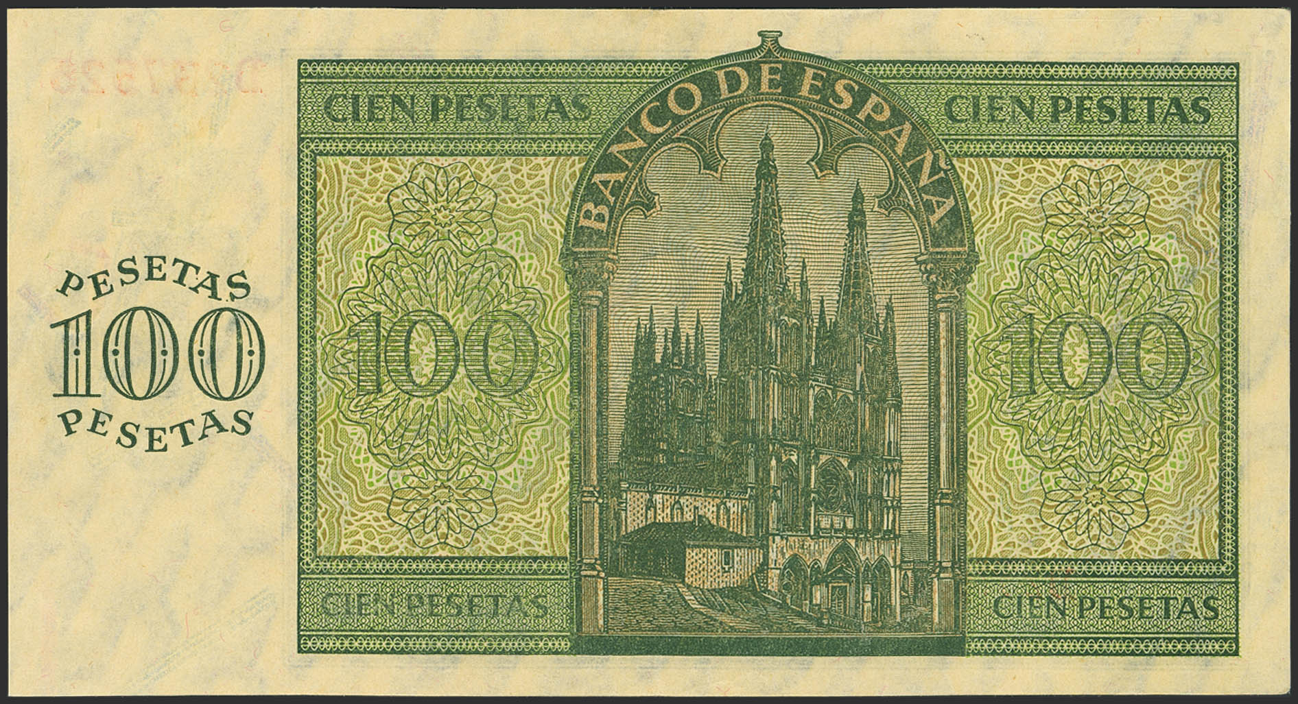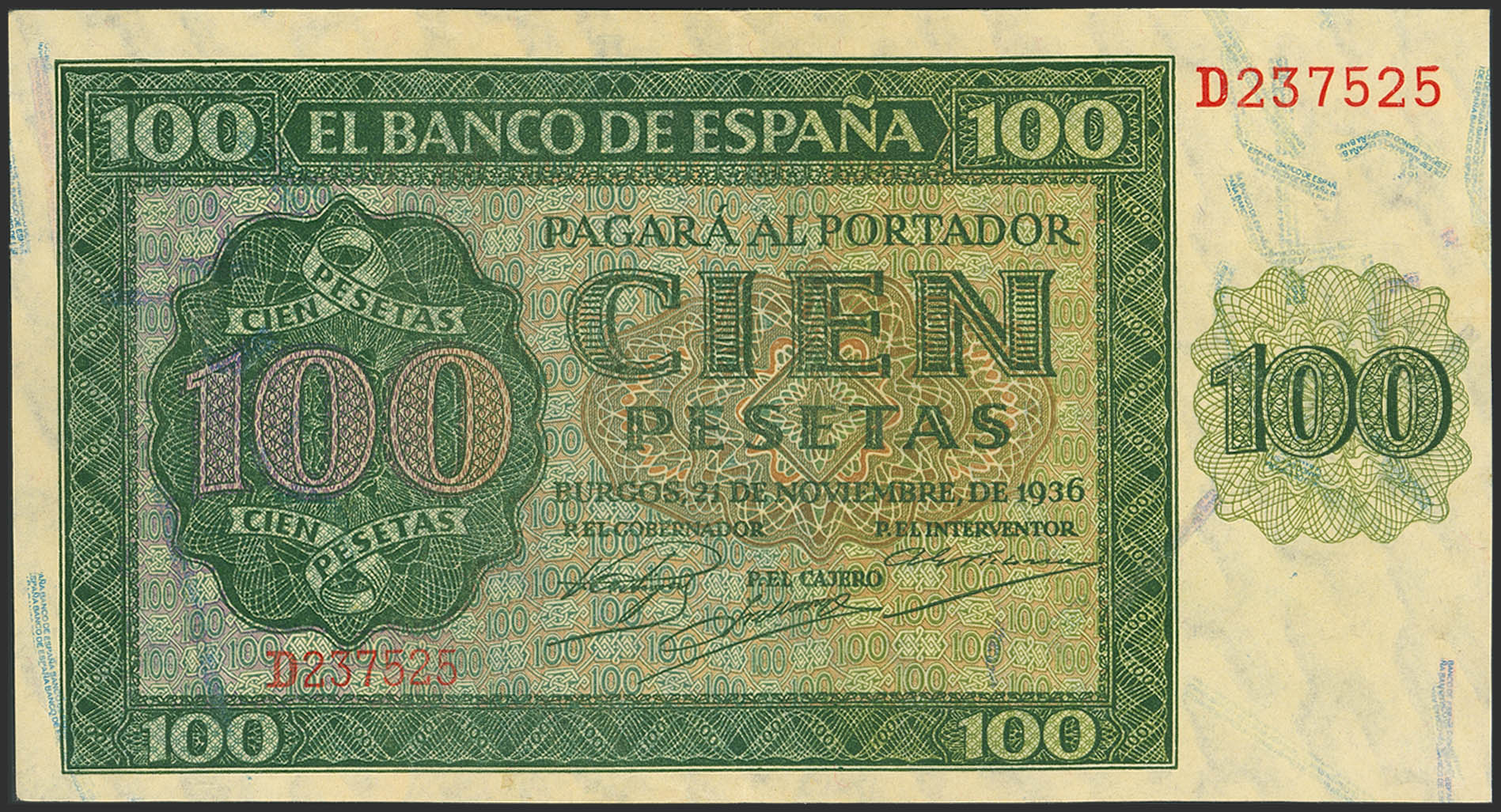 100 Pesetas. 21 de Noviembre de 1936. Serie D. (Edifil 2023: 421a). Conserva parte de su apresto original. EBC.