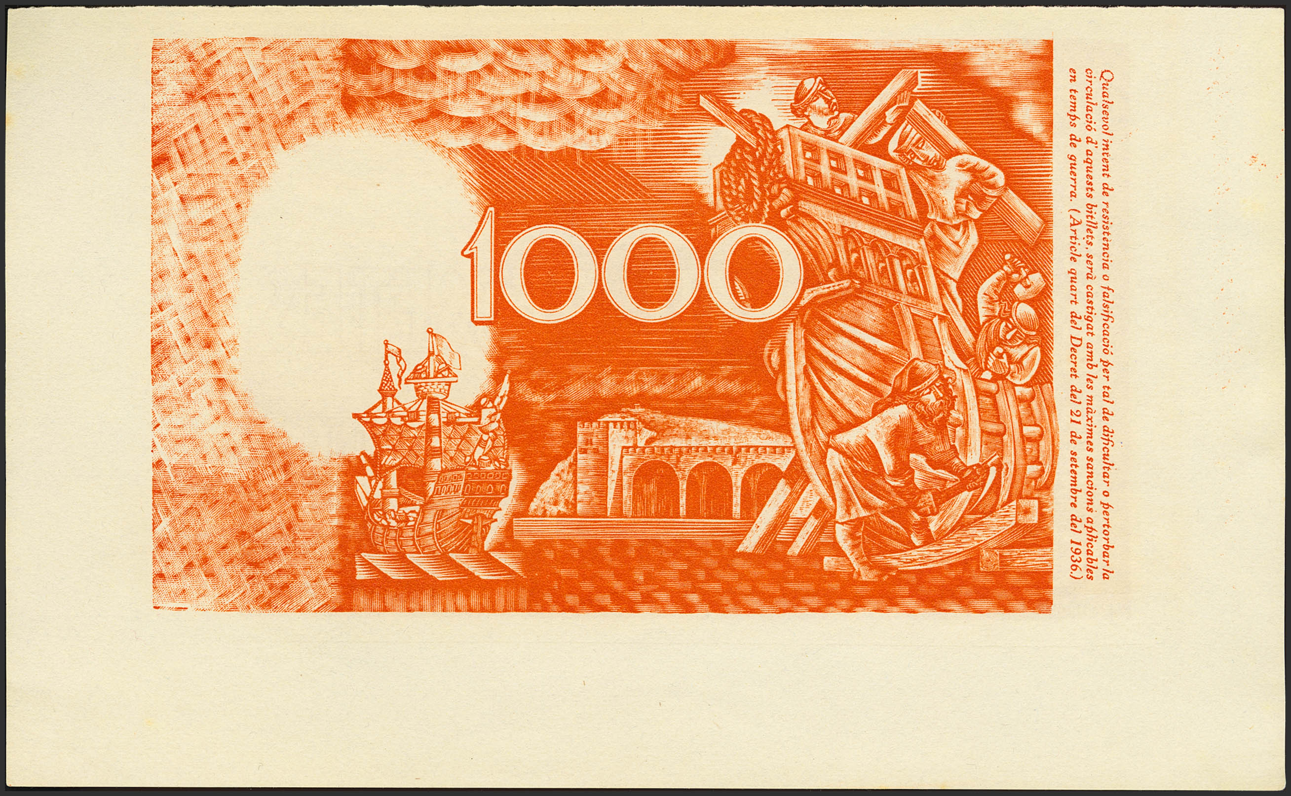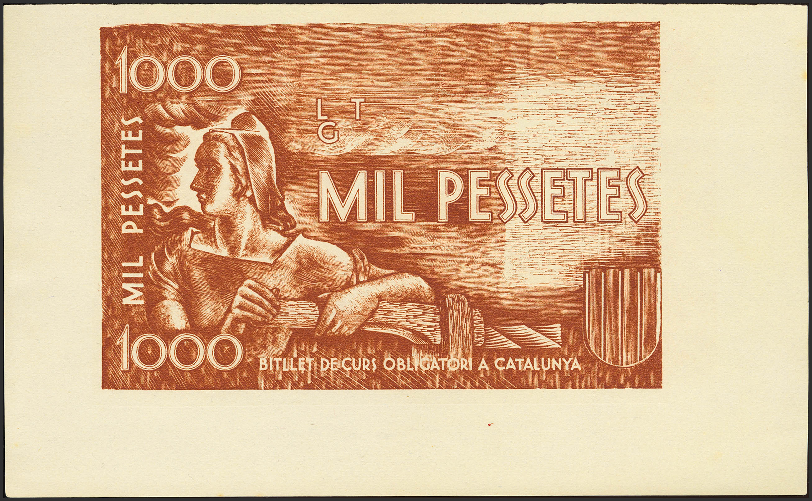 Prueba en color marrón de un billete No Emitido de la Generalitat de Catalunya de 1000 Pesetas, según el decreto del 21 de Diciembre de 1936. (billete emitido privadamente, sin respaldo legal). SC-.
