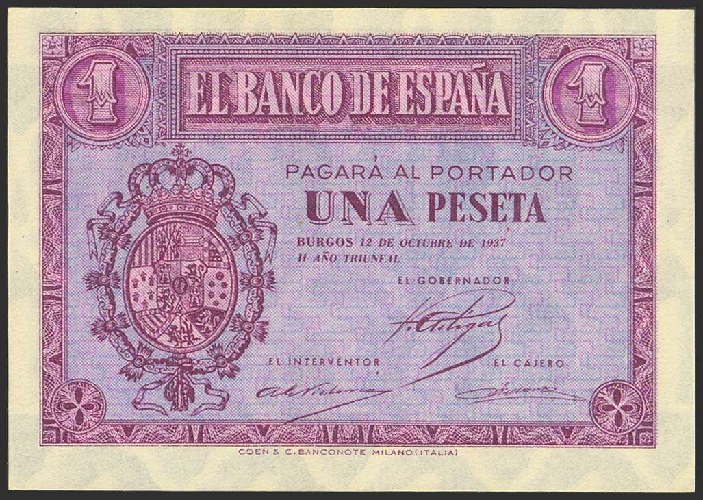 1 Peseta. 12 de Octubre de 1937. Serie E. (Edifil 2023: 425a). Apresto original. SC.