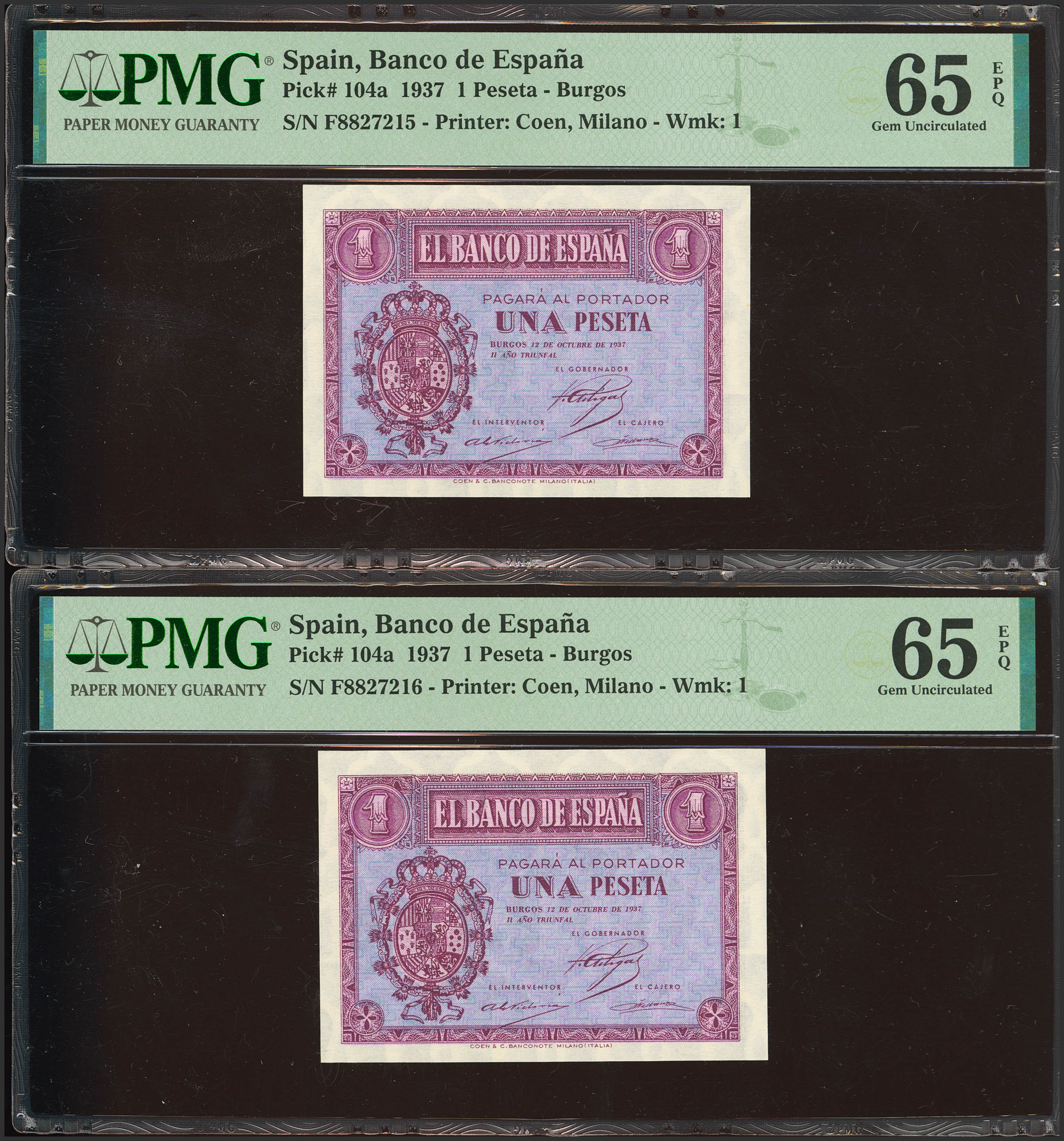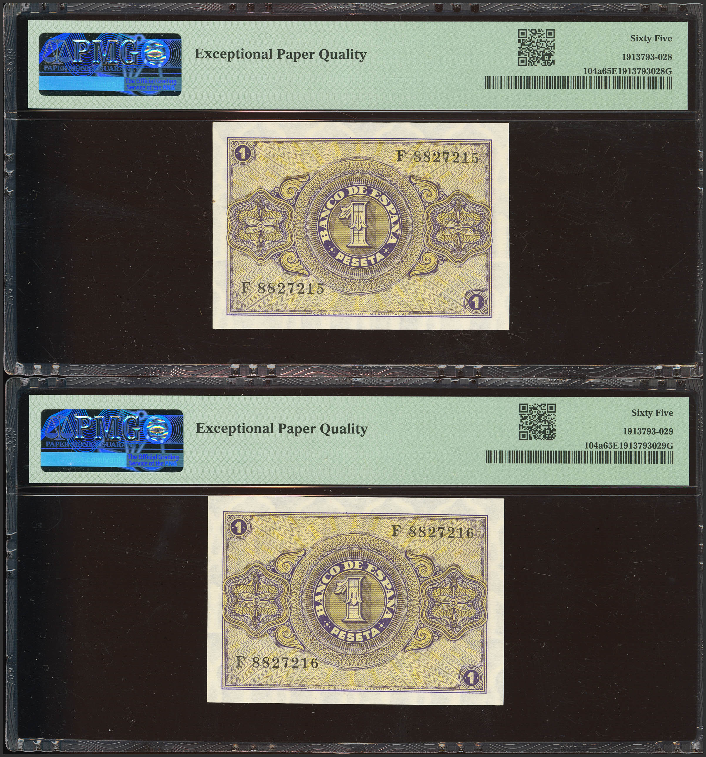 1 Peseta. 12 de Octubre de 1937. Pareja correlativa. Serie F, última serie emitida. (Edifil 2023: 425b, Pick: 104a). Apresto original. SC. Encapsulados PMG65EPQ, ambos.