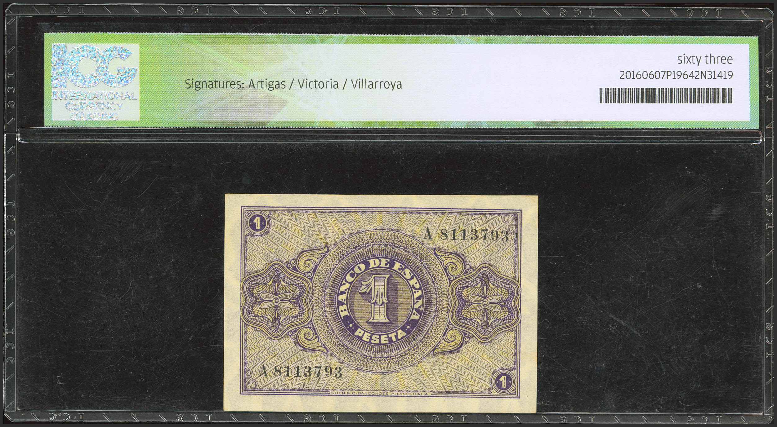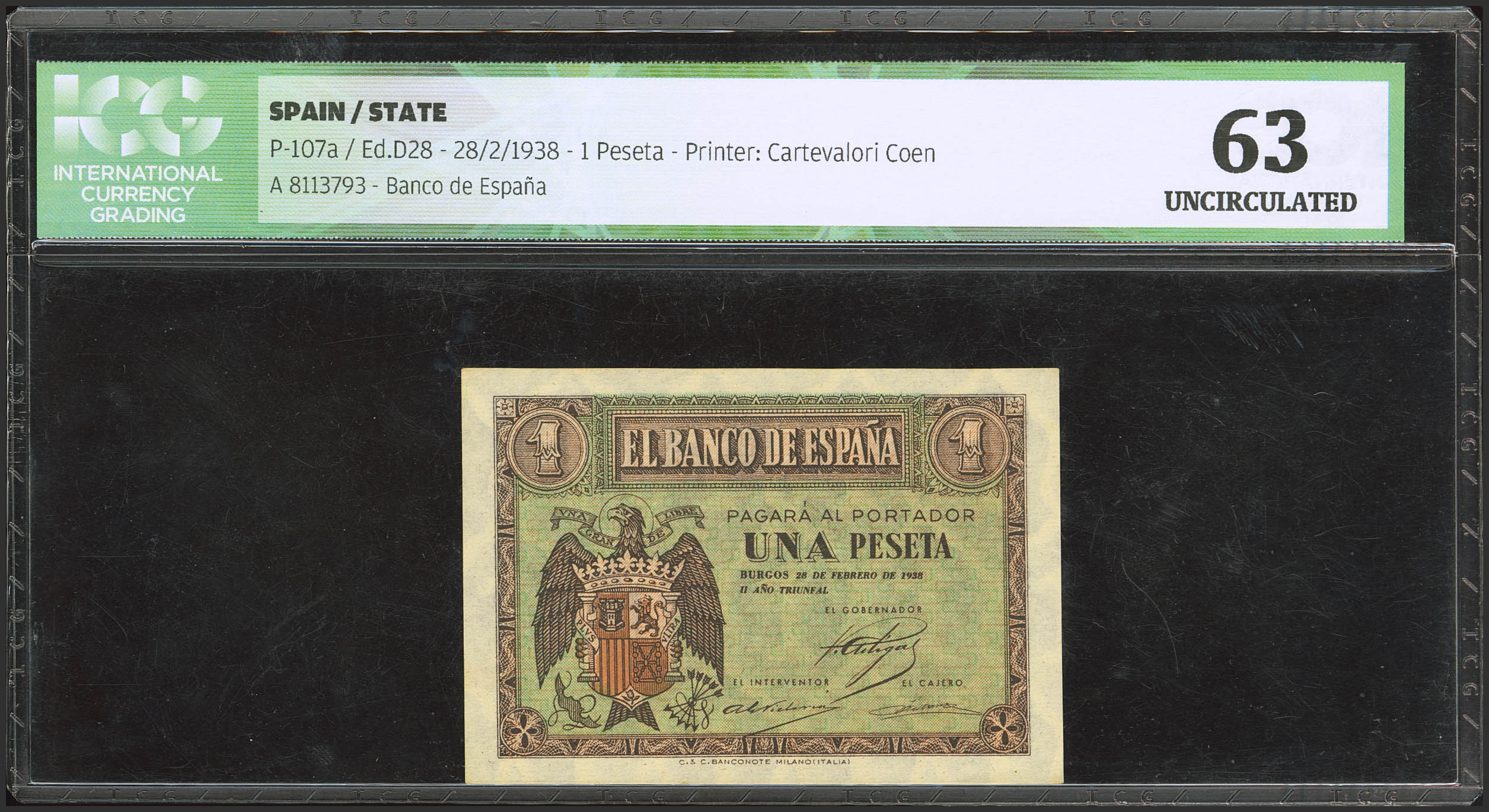 1 Peseta. 28 de Febrero de 1938. Serie A. (Edifil 2023: 427, Pick: 107a). SC-. Encapsulado ICG63.