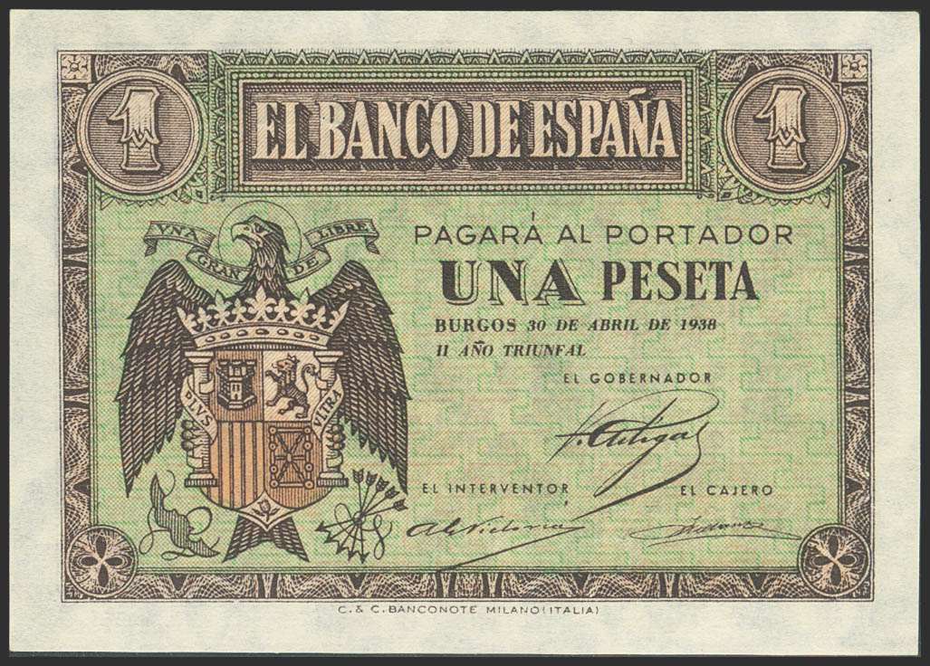 1 Peseta. 30 de Abril de 1938. Serie D. (Edifil 2023: 428a). Apresto original. SC.