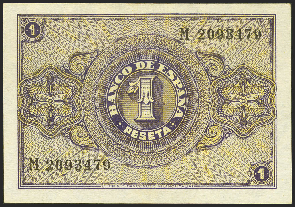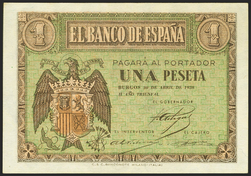 1 Peseta. 30 de Abril de 1938. Serie M. (Edifil 2021: 428a). Apresto original. SC.