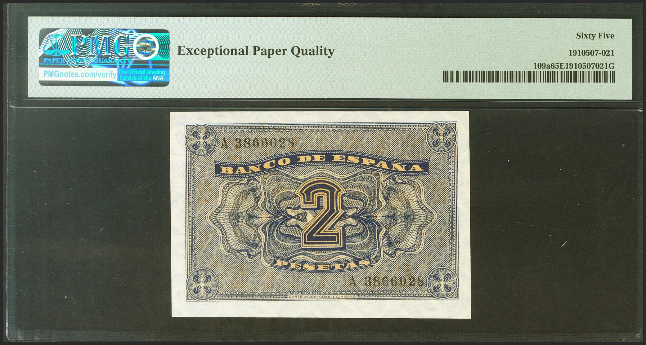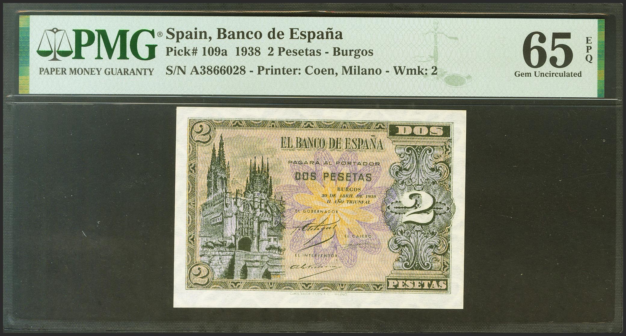 2 Pesetas. 30 de Abril de 1938. Serie A. (Edifil 2021: 429). Inusual en esta conservación con todo su apresto original. SC. Encapsulado PMG65EPQ