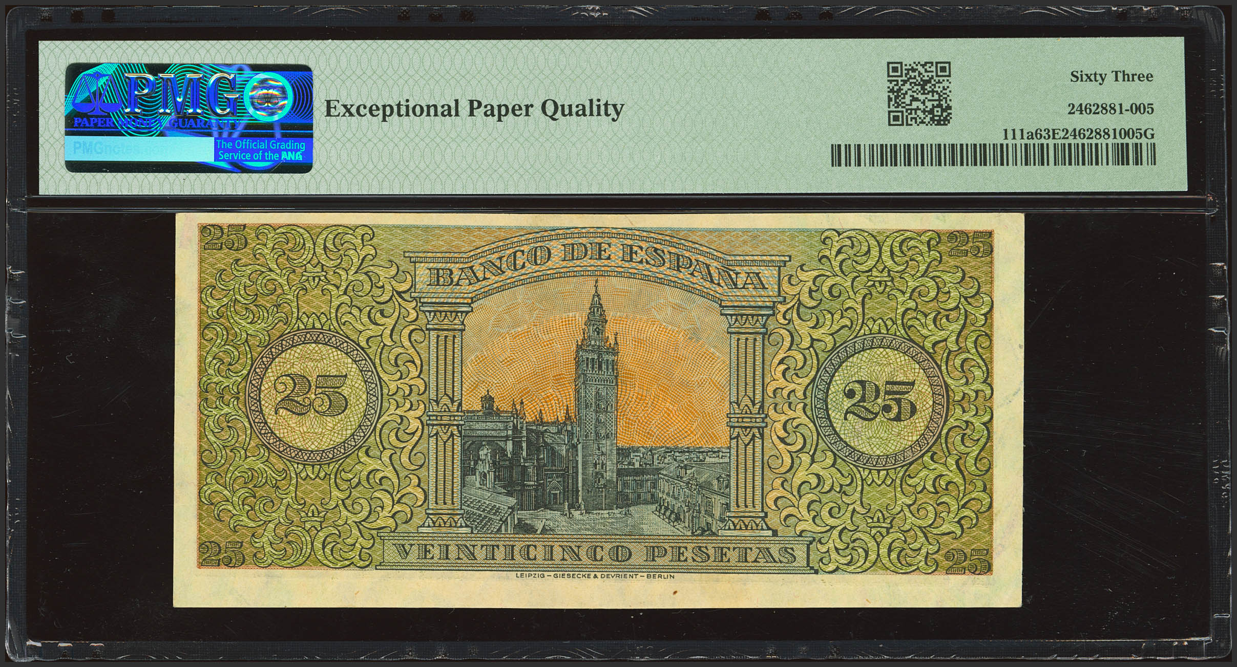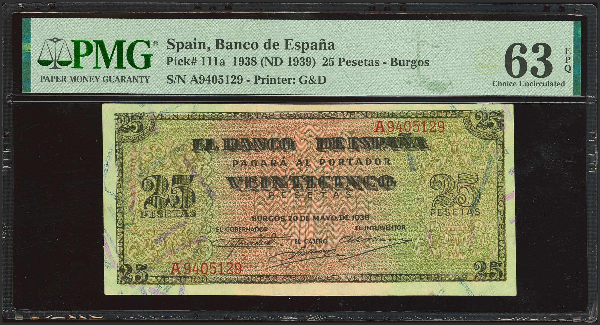 25 Pesetas. 20 de Mayo de 1938. Serie A. (Edifil 2023: 430, Pick: 111a). Apresto original. SC. Encapsulado PMG63EPQ.
