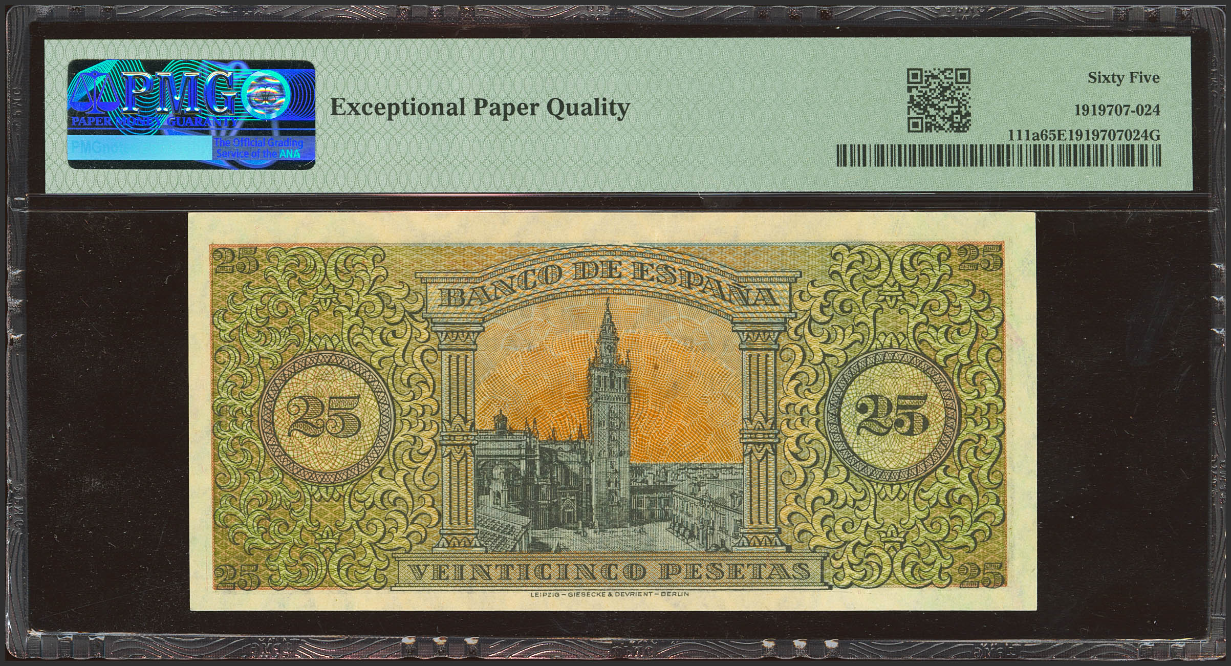25 Pesetas. 20 de Mayo de 1938. Serie C. (Edifil 2023: 430a, Pick: 111a). Inusual en esta calidad, apresto original. SC. Encapsulado PMG65EPQ.
